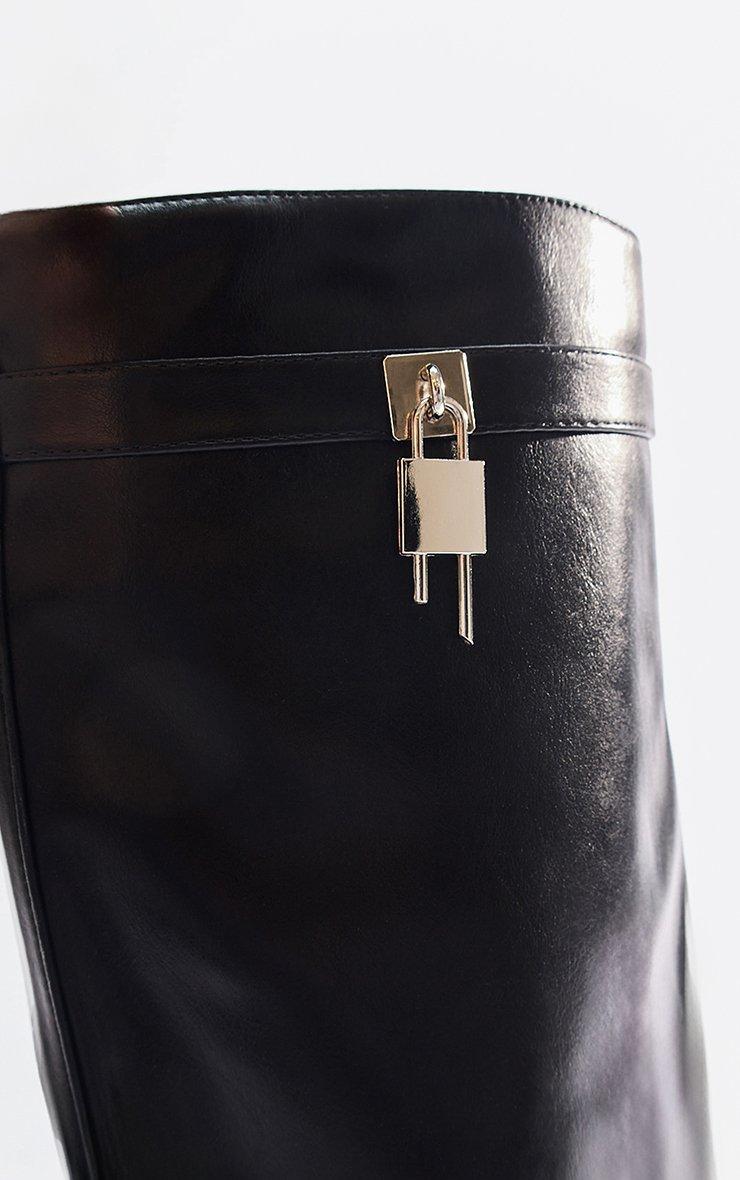 I-Am-The-One Padlock Detail Wedge Heel Knee High Long Boot In Black Faux Leather