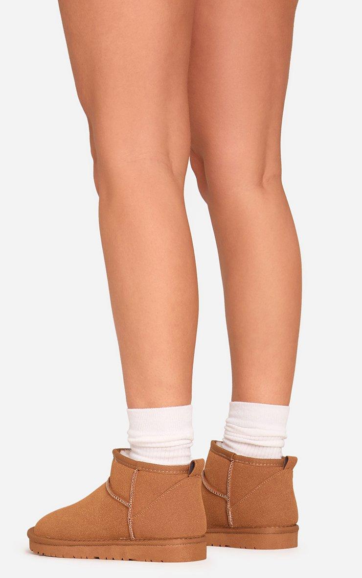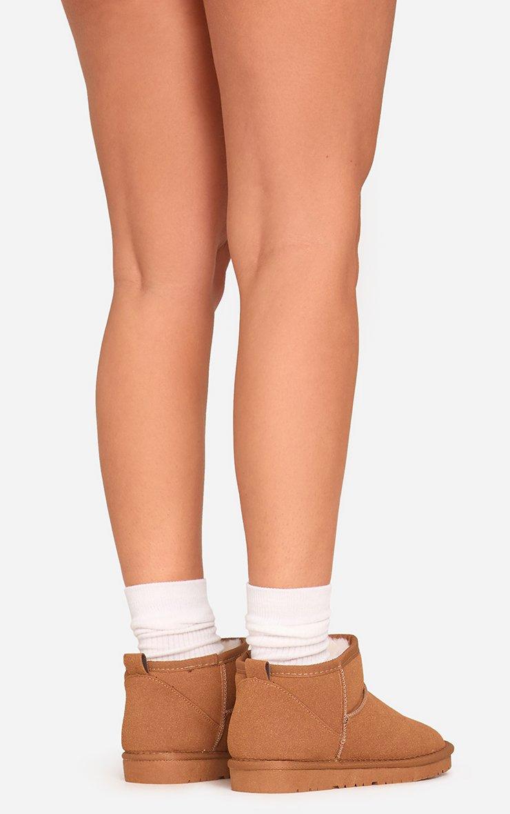 ultra mini ankle length faux fur lining boots in chestnut brown faux suede