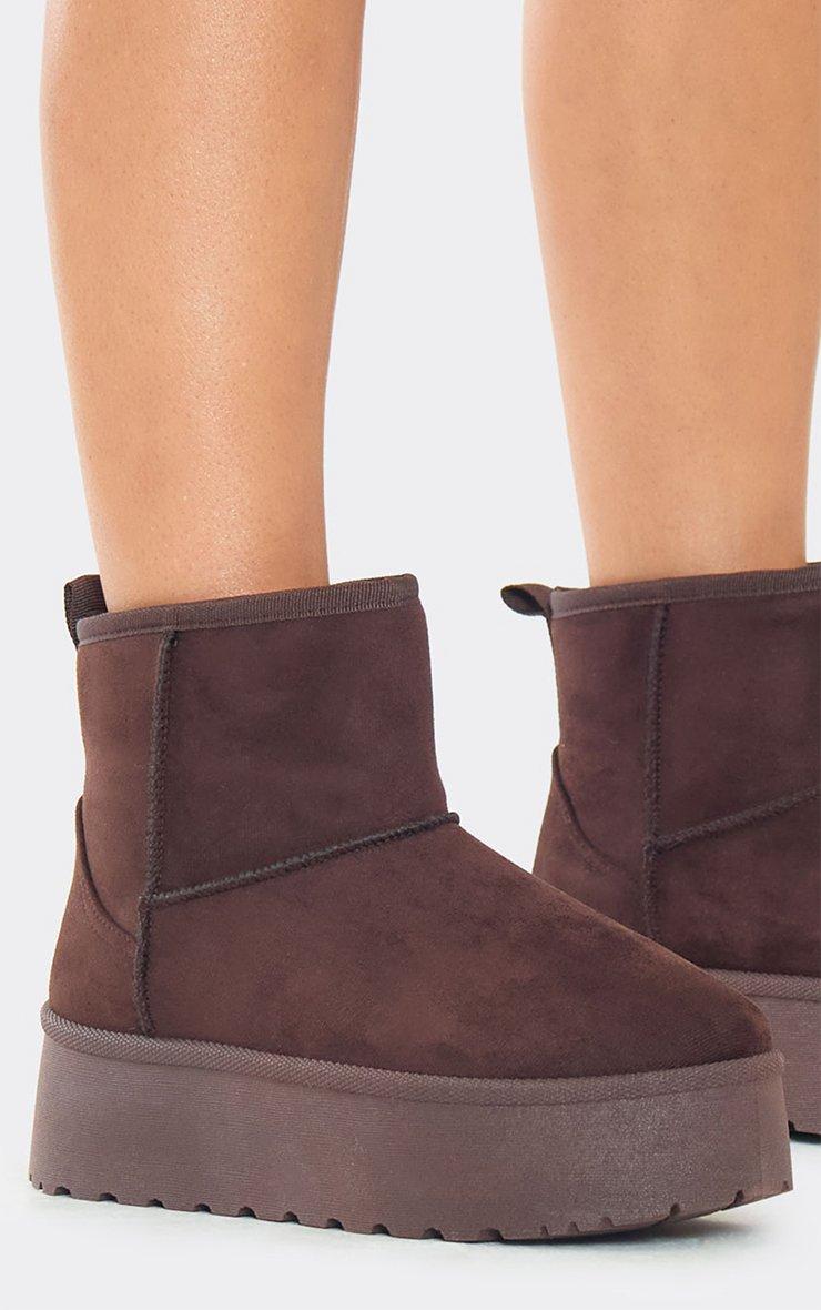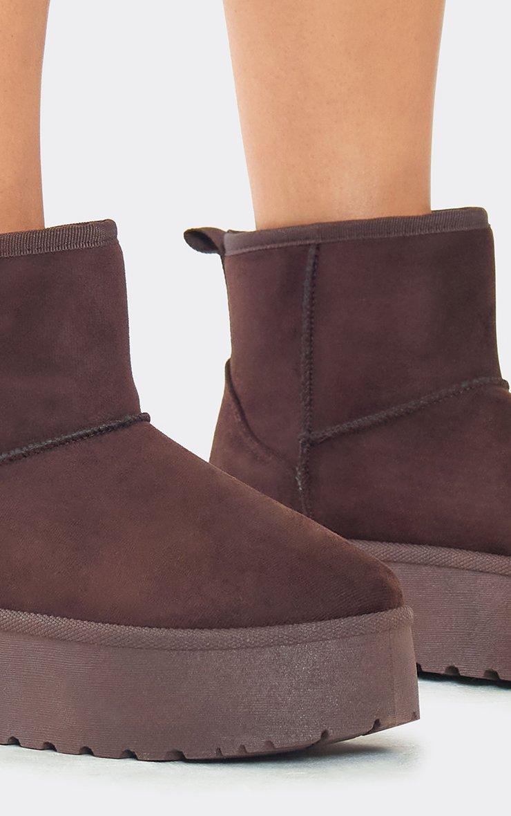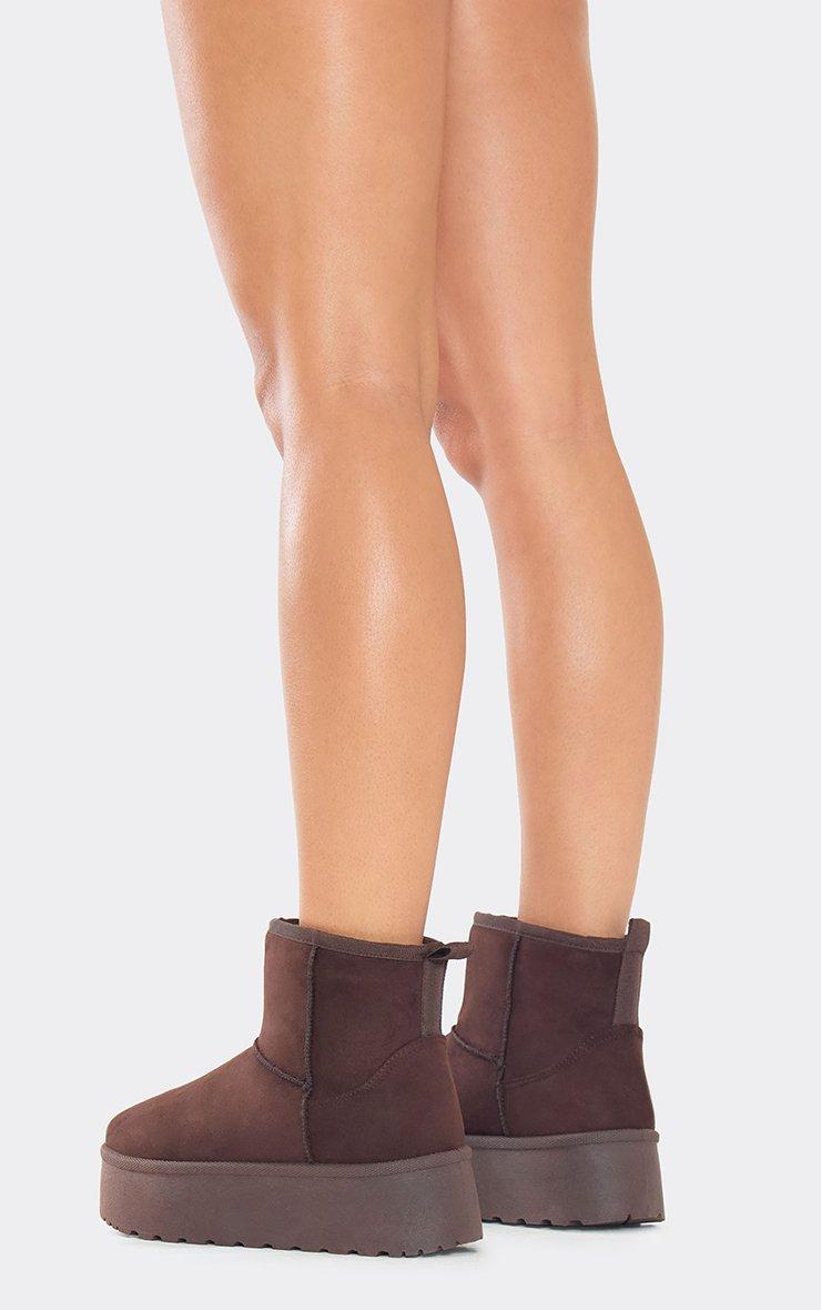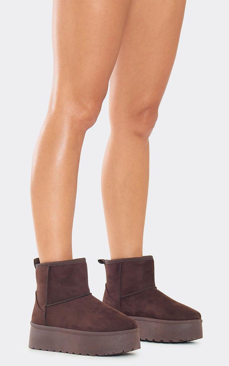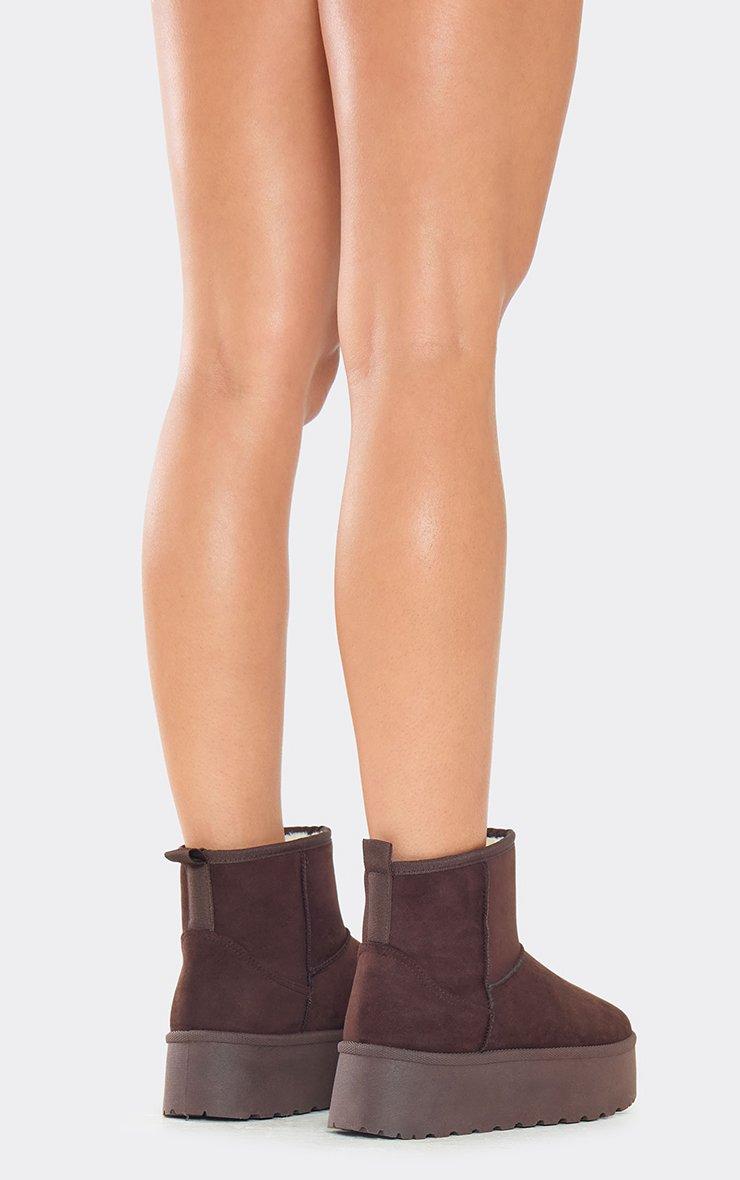 Pumpkin Platform Sole Faux Fur Lining Ultra Mini Ankle Boot In Brown Faux Suede