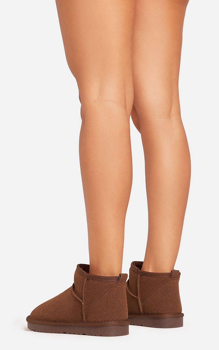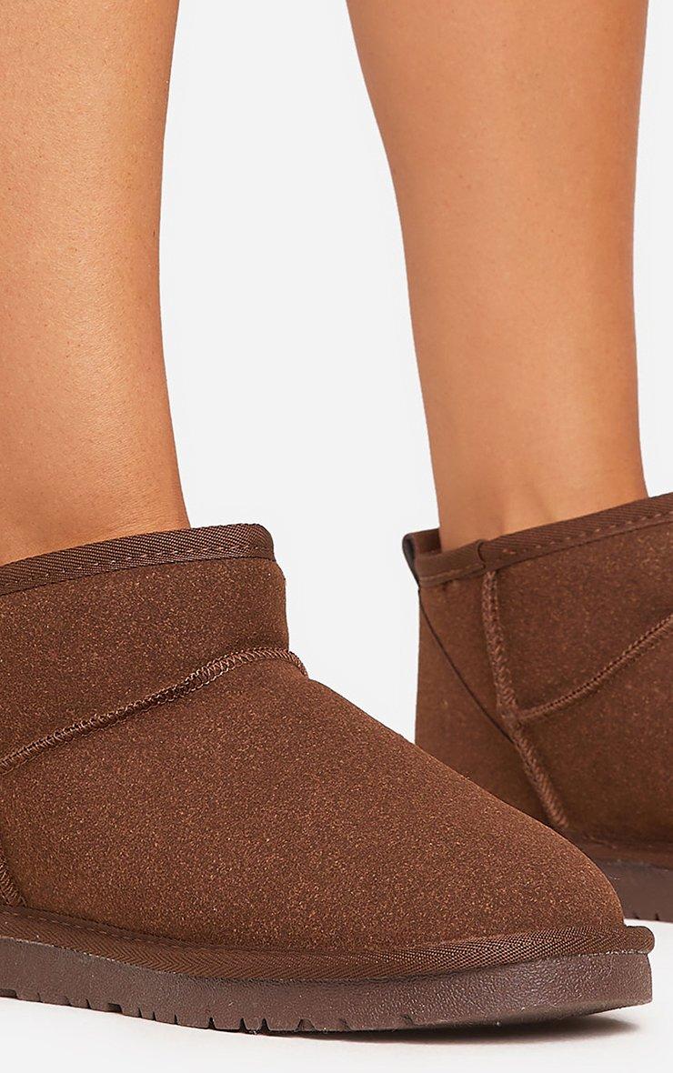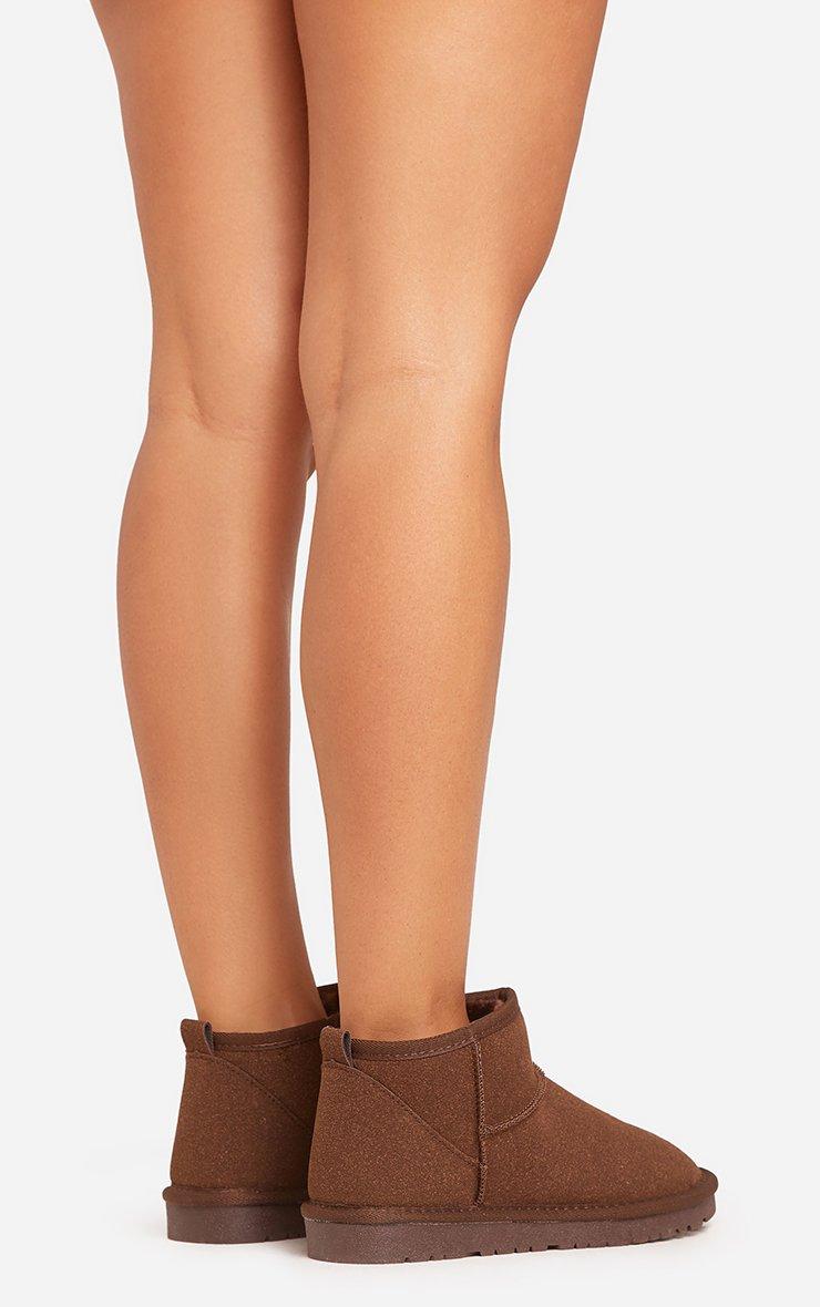 ultra mini ankle length faux fur lining boots in dark brown faux suede
