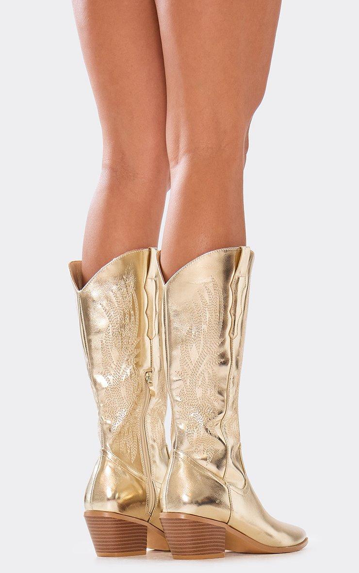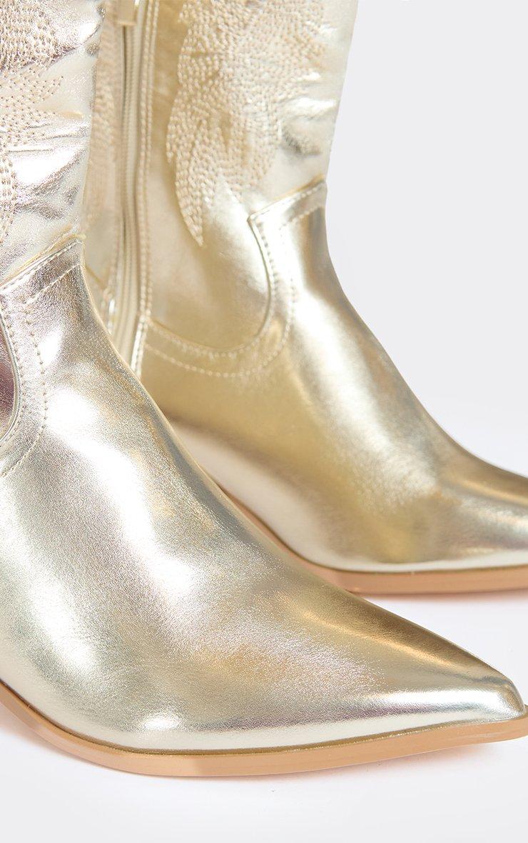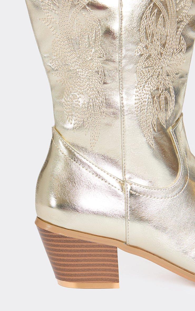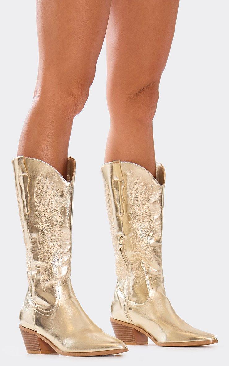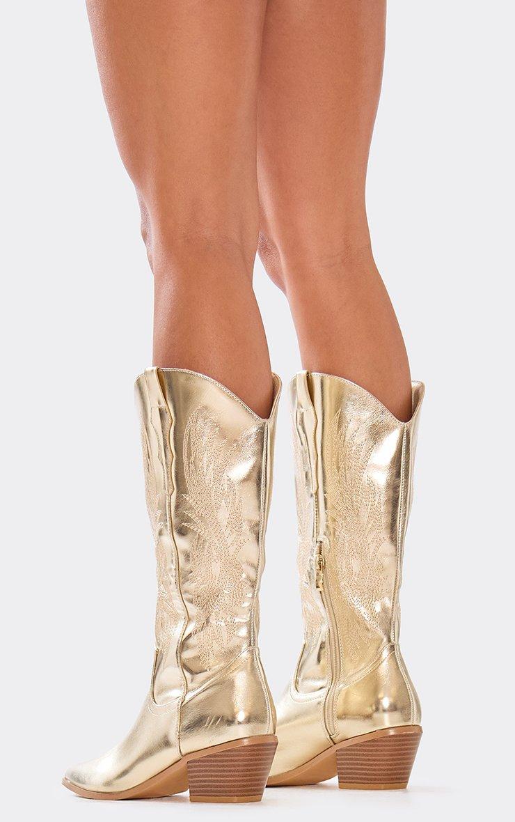 Eclipse Embroidered Detail Pointed Toe Mid Calf Western Cowboy Boot In Gold Faux Leather