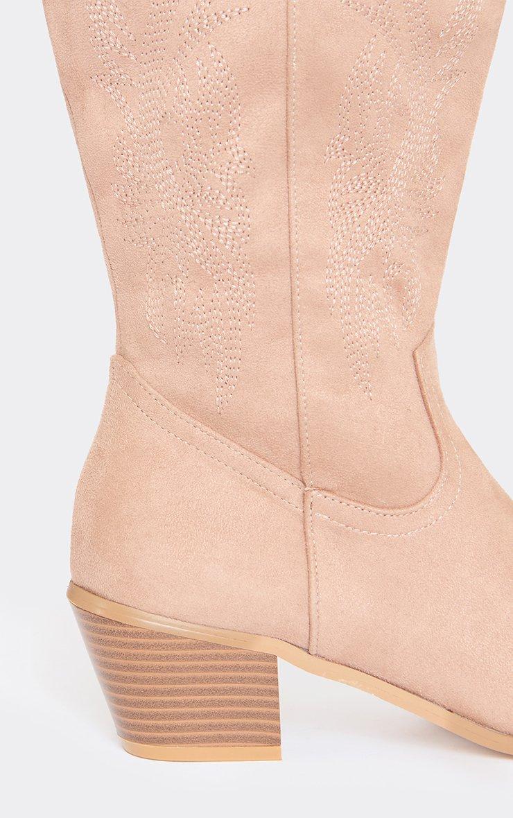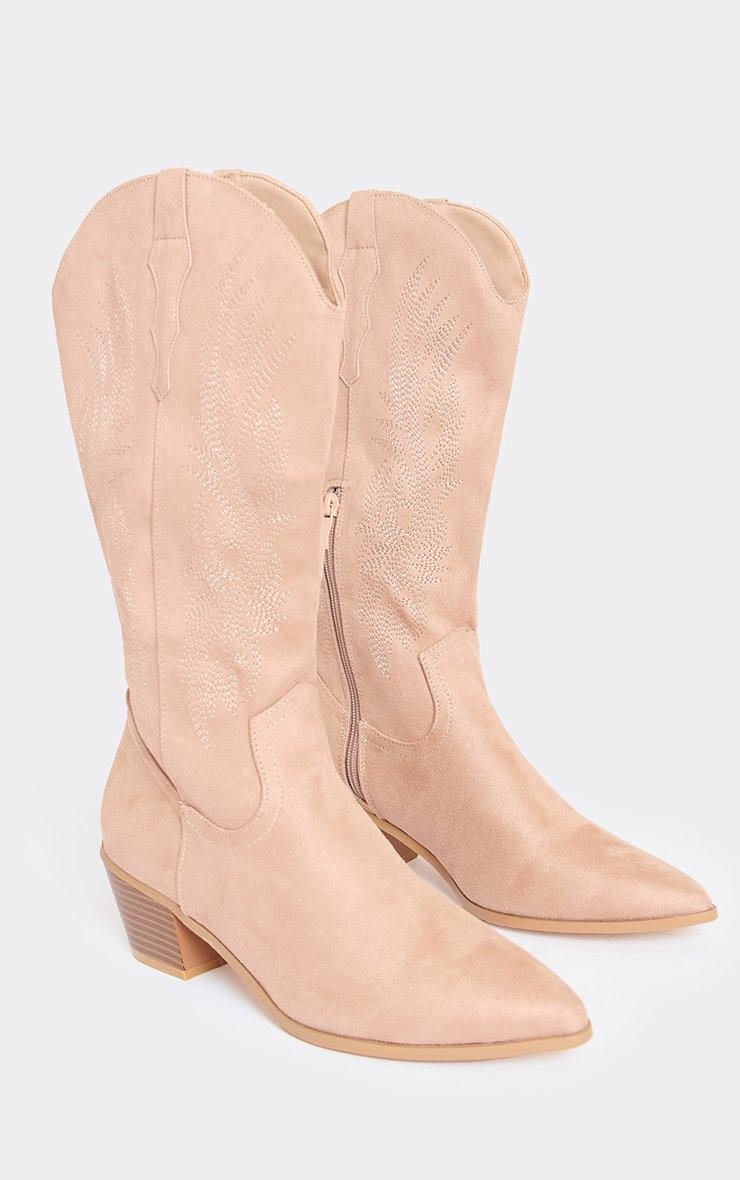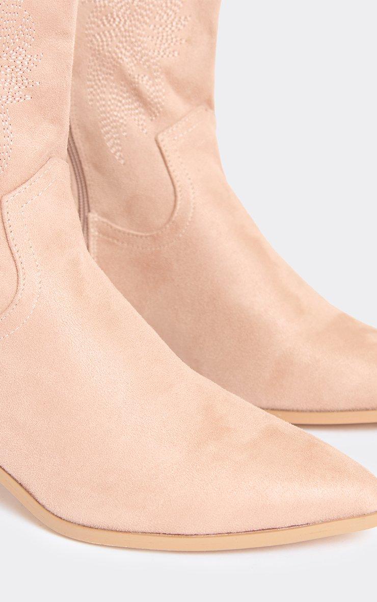 Eclipse Embroidered Detail Pointed Toe Mid Calf Western Cowboy Boot In Beige Faux Suede