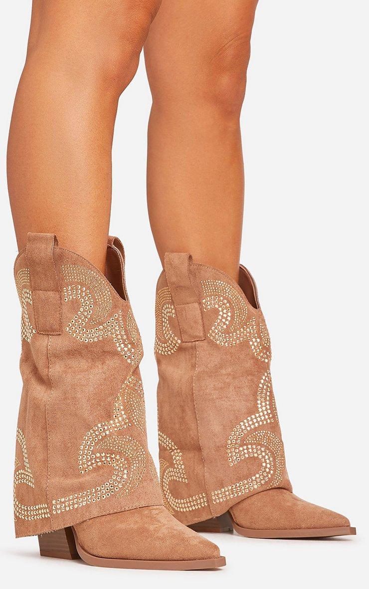 storm embroidered flared detail pointed toe western cowboy boot in tan brown faux suede