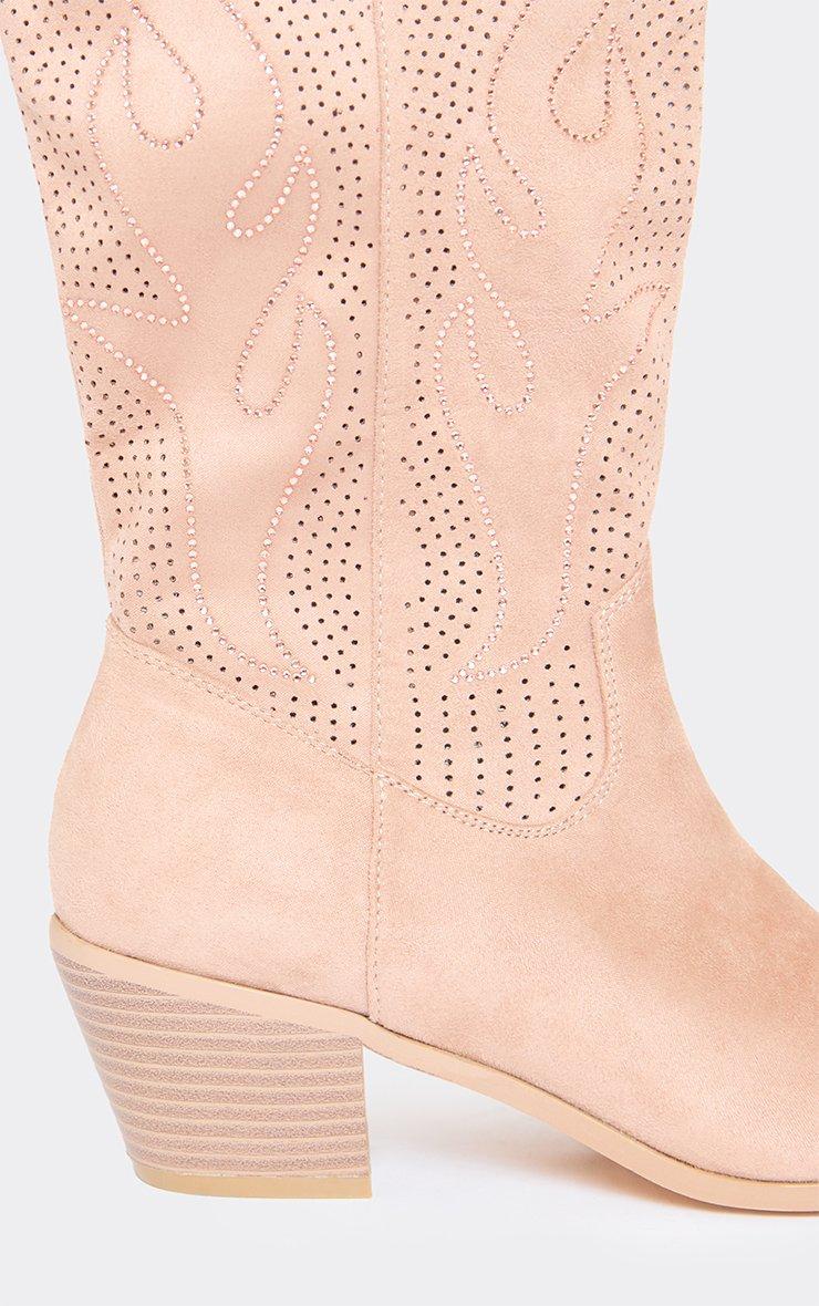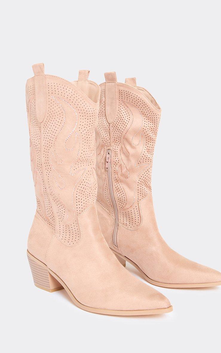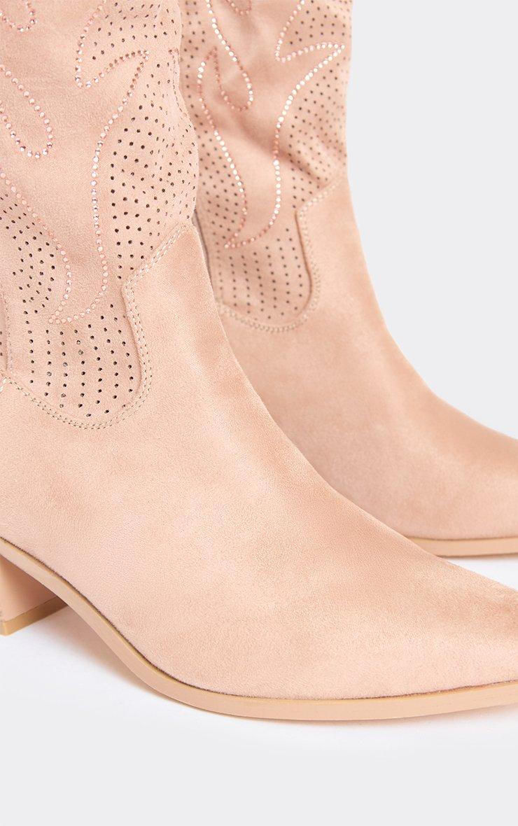 Racing Diamante Embroidered Detail Pointed Toe Mid Calf Western Cowboy Boot In Taupe Faux Suede
