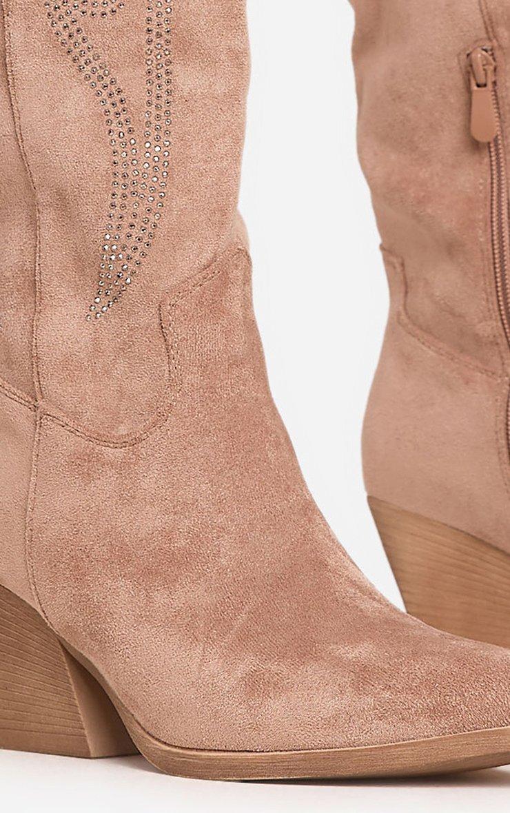 Izzy Diamante Detail Pointed Toe Knee High Western Cowboy Boot In Light Brown Faux Suede