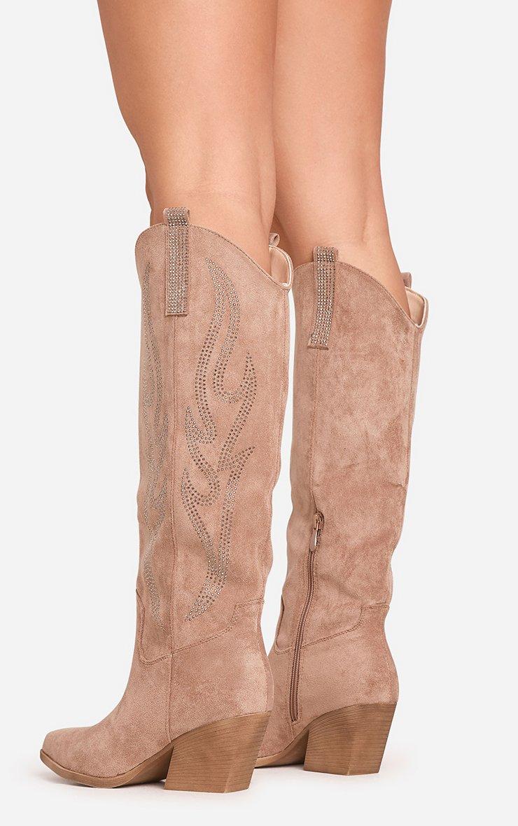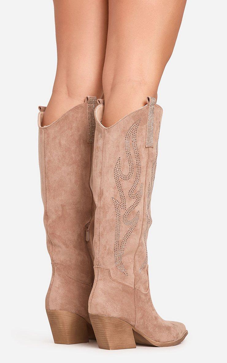 izzy diamante detail pointed toe knee high western cowboy boot in light brown faux suede