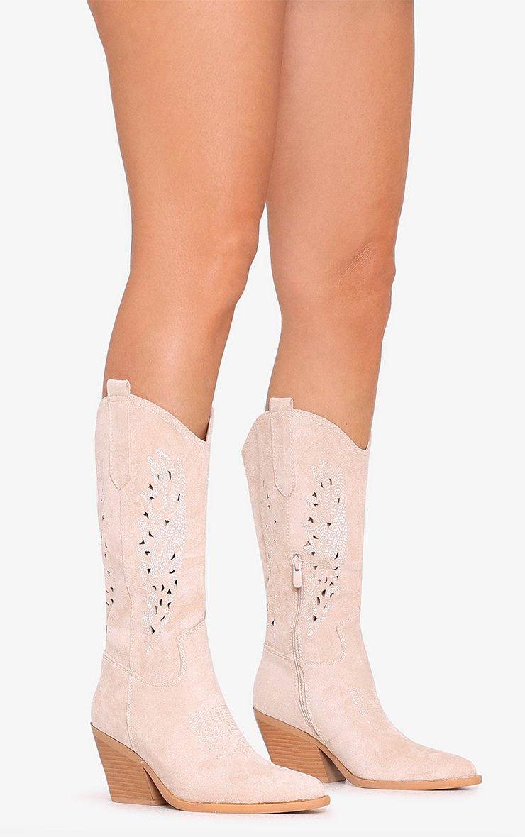 Citrus Cut Out Laser Detail Pointed Toe Mid Calf Western Cowboy Boot In Beige Faux Suede