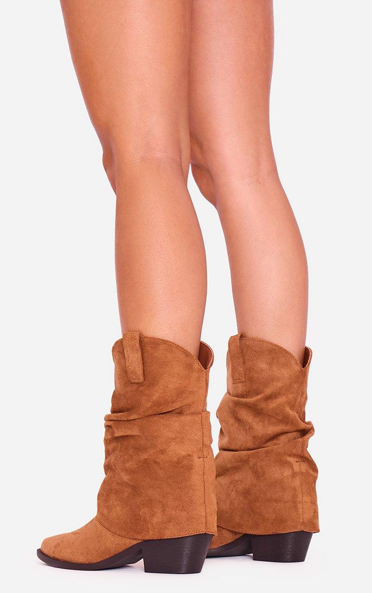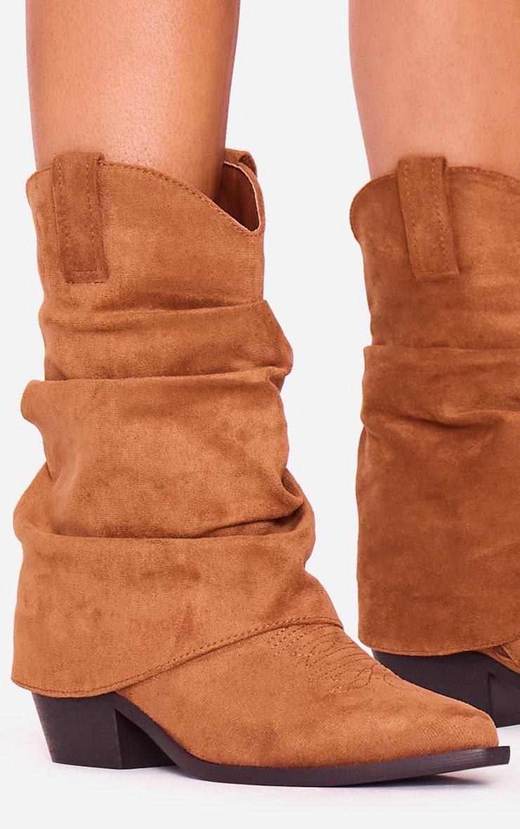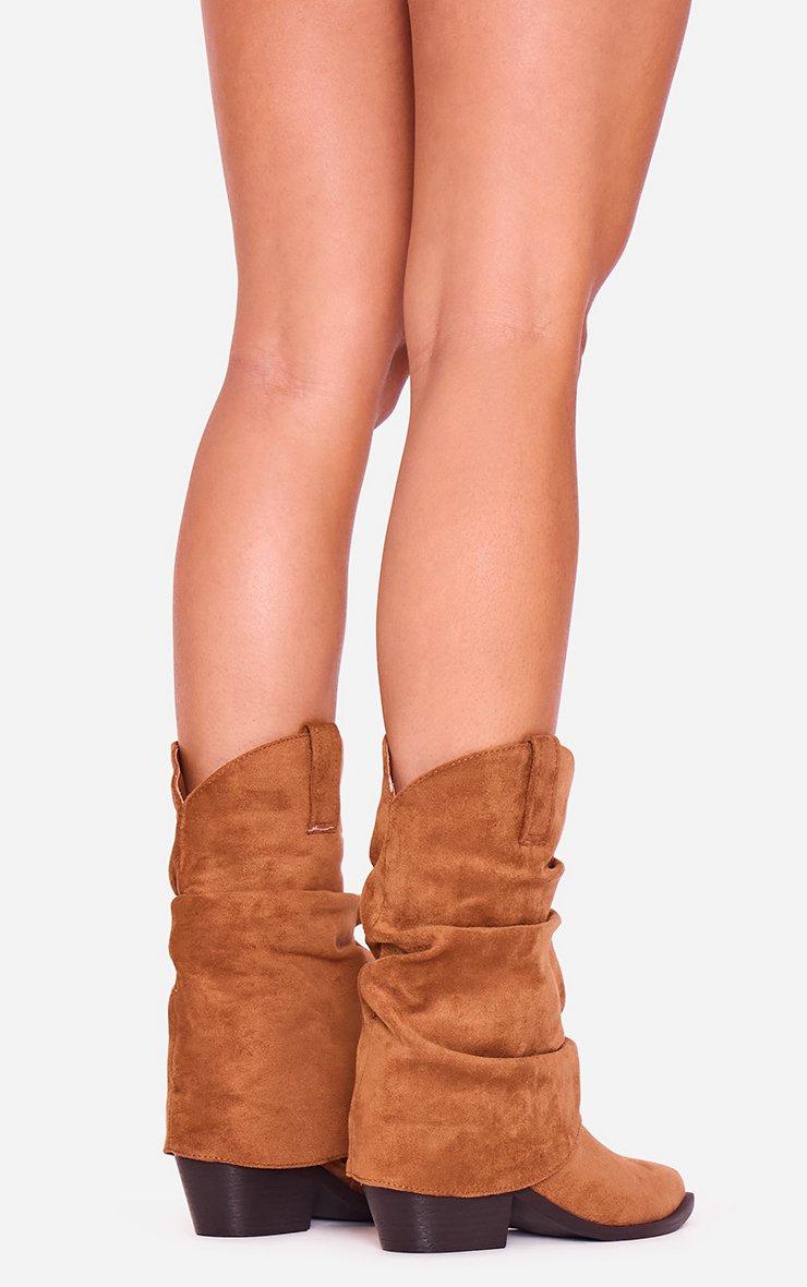 Ruban Pointed Toe Ruched Mid Calf Boot In Tan Brown Faux Suede