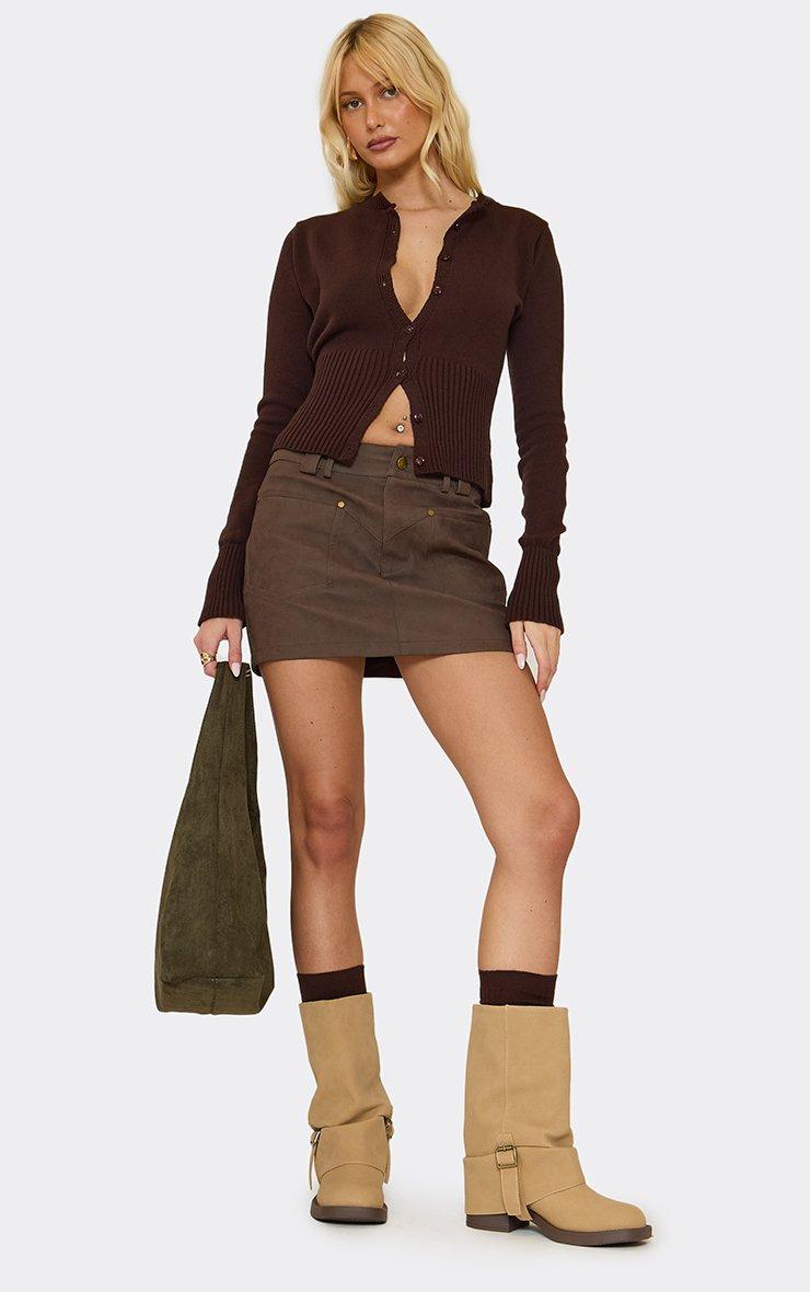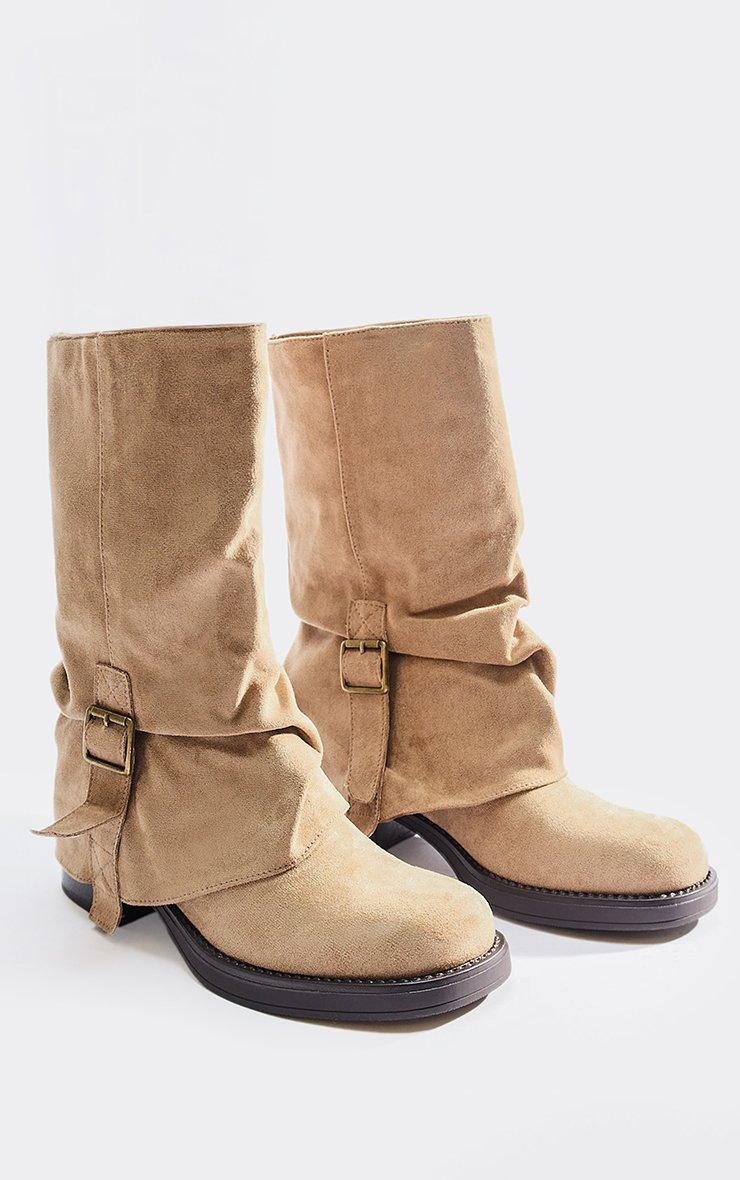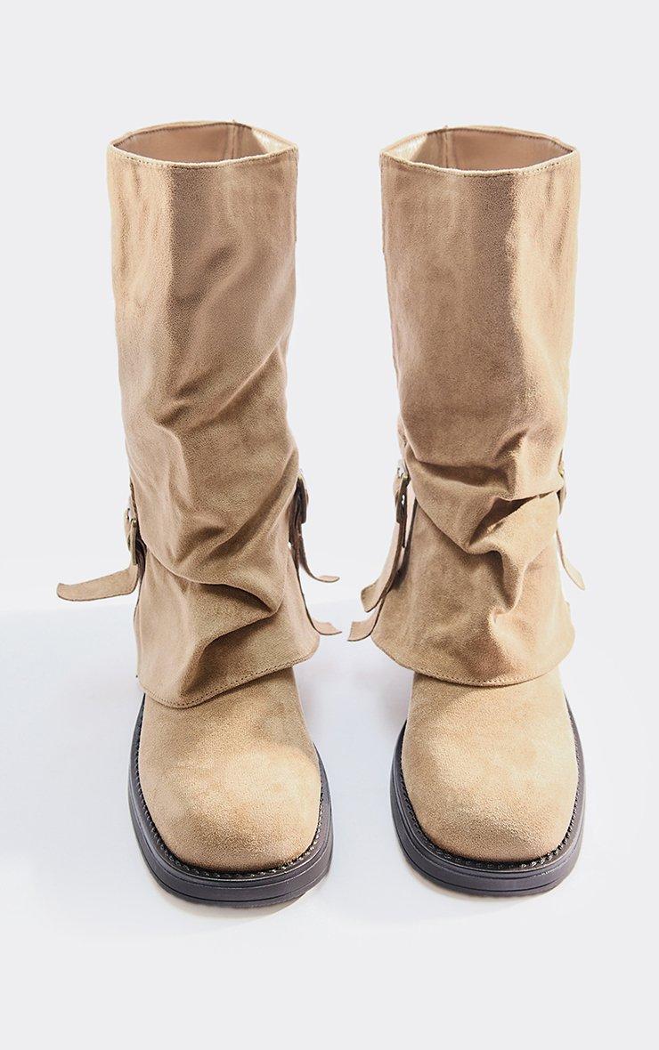 Jamming Zip Buckle Zip Detail Knee High Biker Boot In Beige Faux Suede