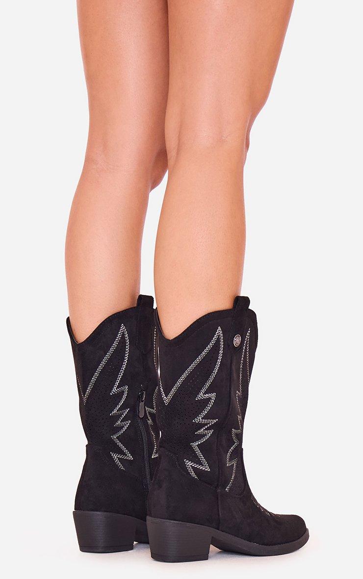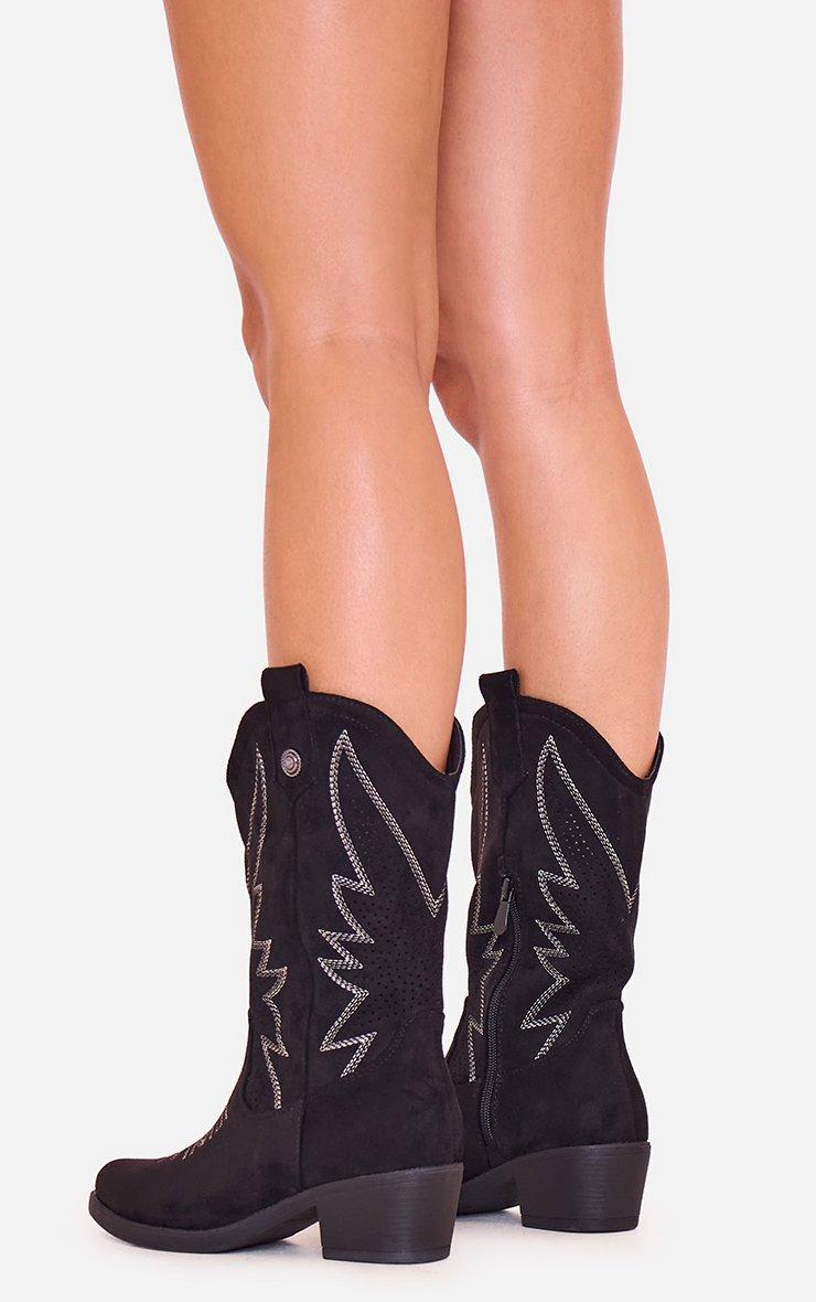 zaria embroidered detail side stud pointed toe mid calf western cowboy boot in black faux suede