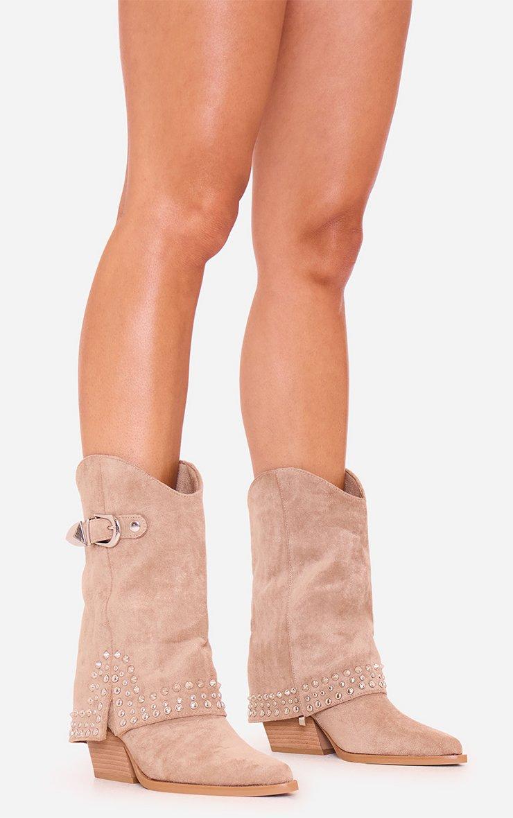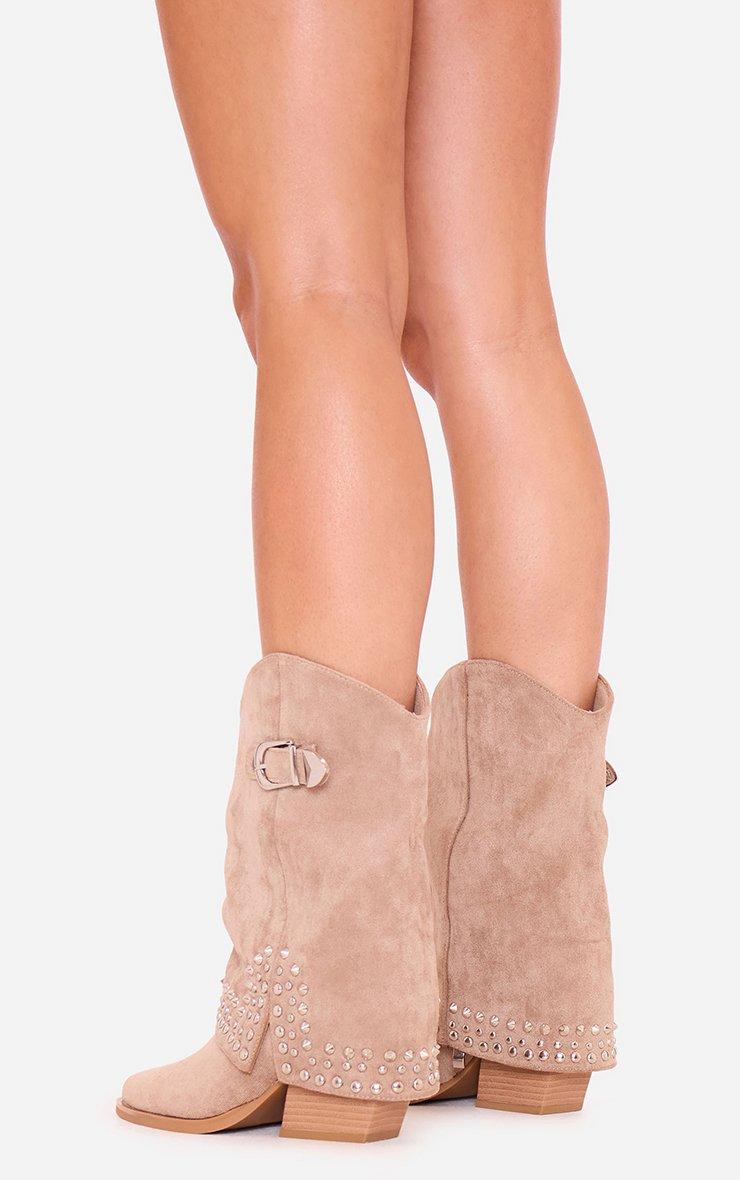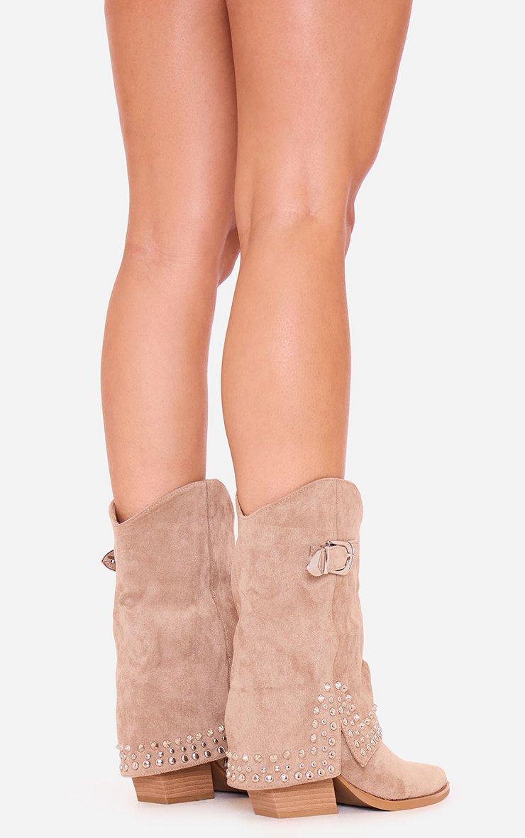 Bae Side Buckle Studded Layered Detail Mid Calf Western Cowboy Boot In Taupe Faux Suede