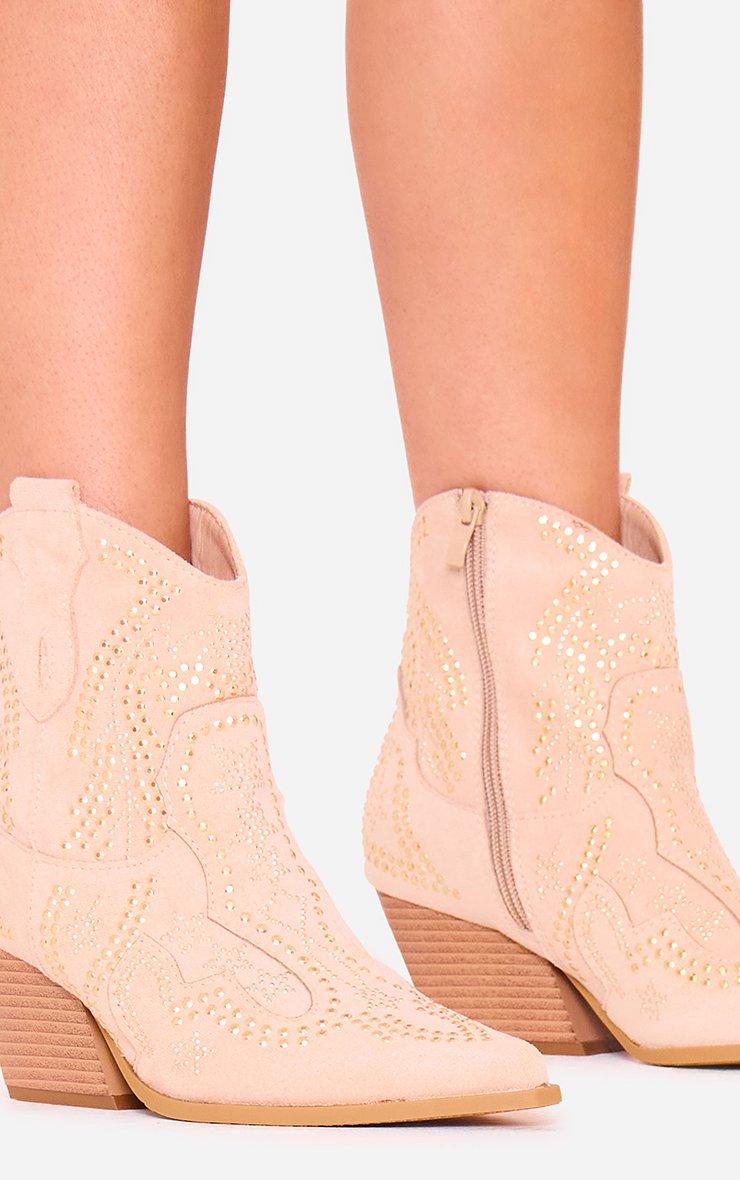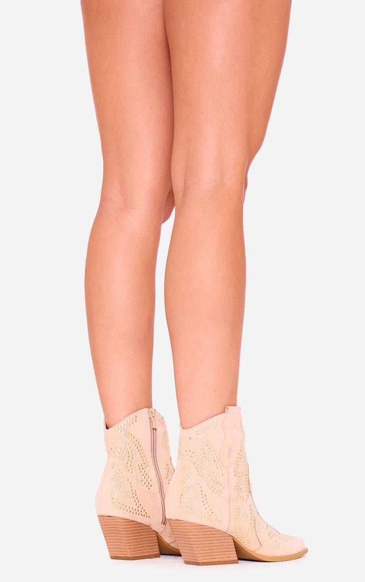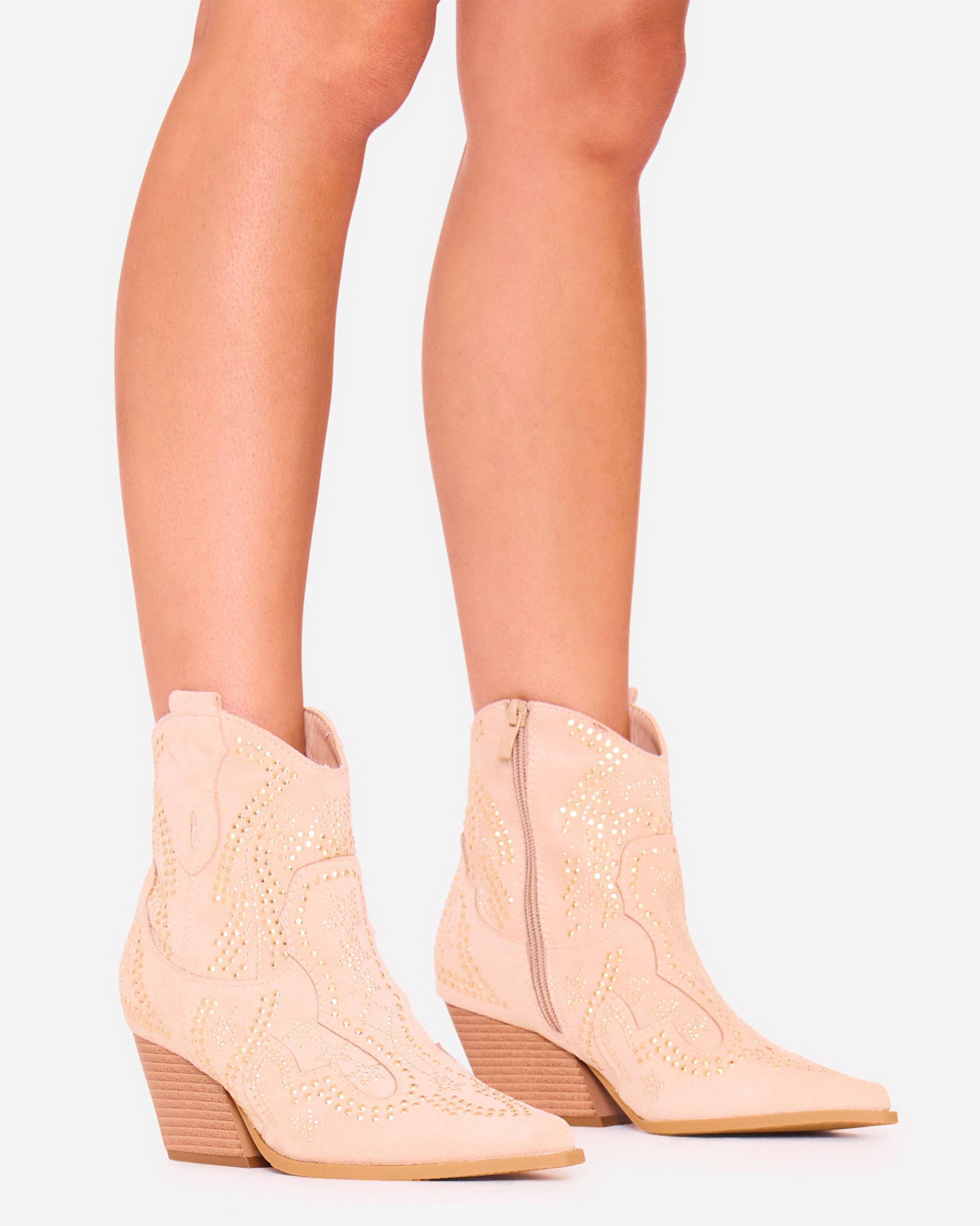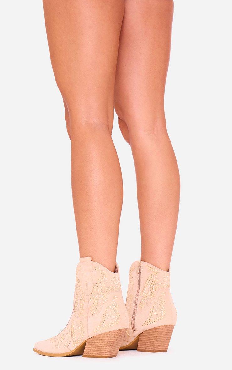 Tommi Embroidered Detail Pointed Toe Ankle Cowboy Boot In Beige Faux Suede
