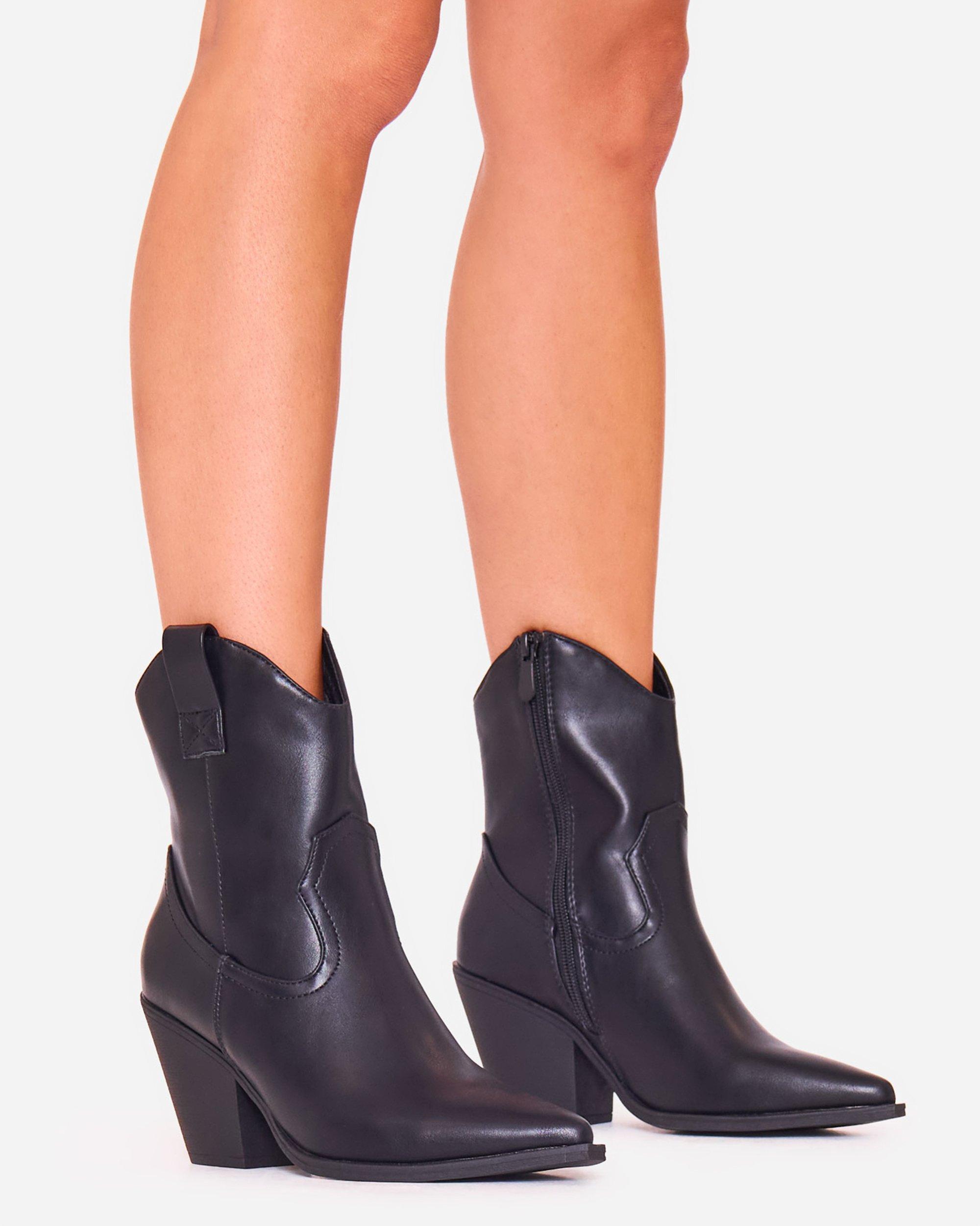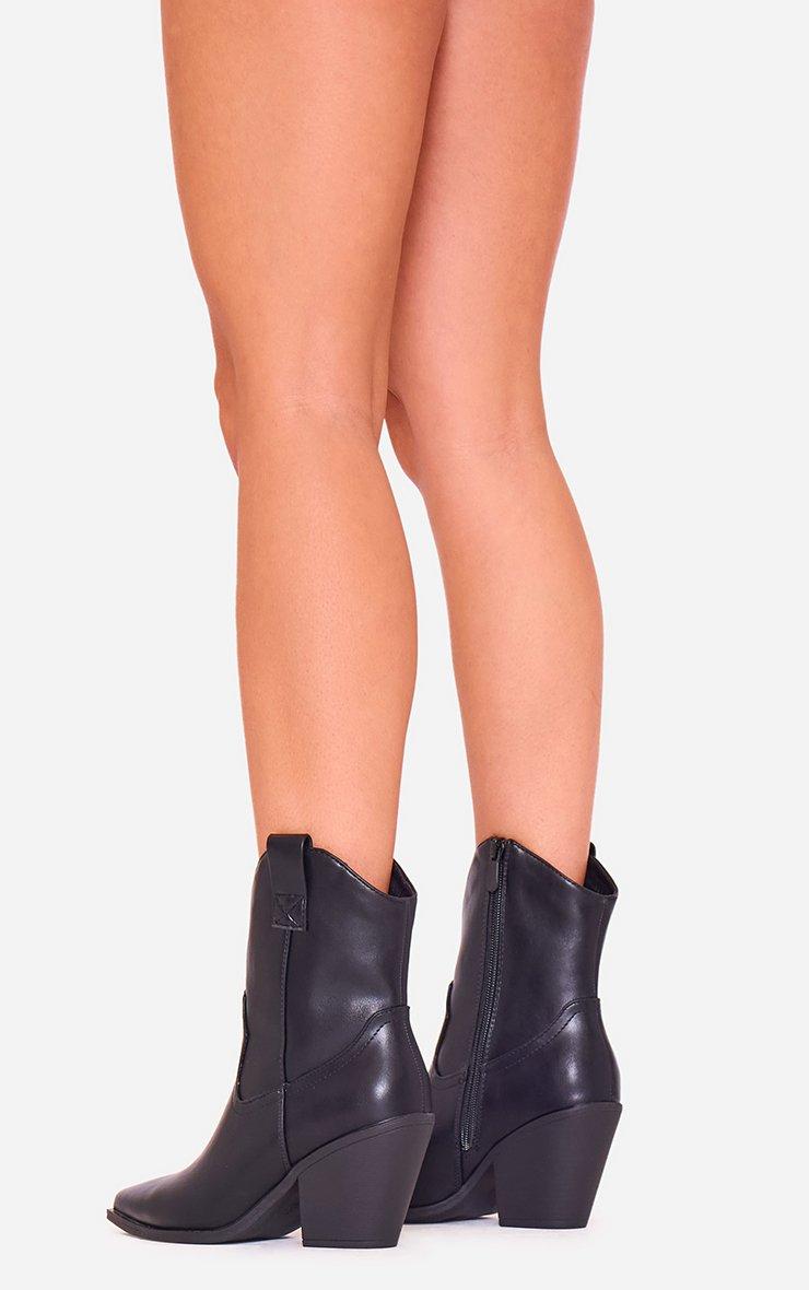Harrison Block Heel Pointed Toe Western Cowboy Ankle Boot In Black Faux Leather