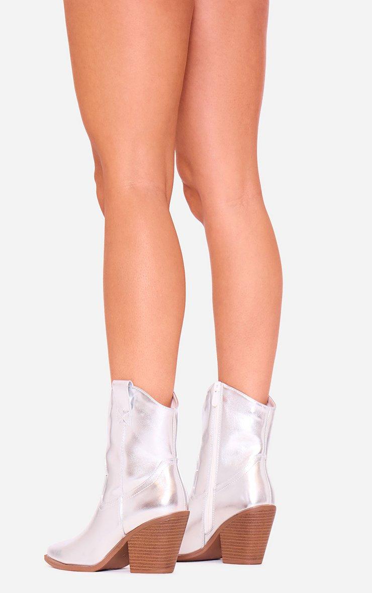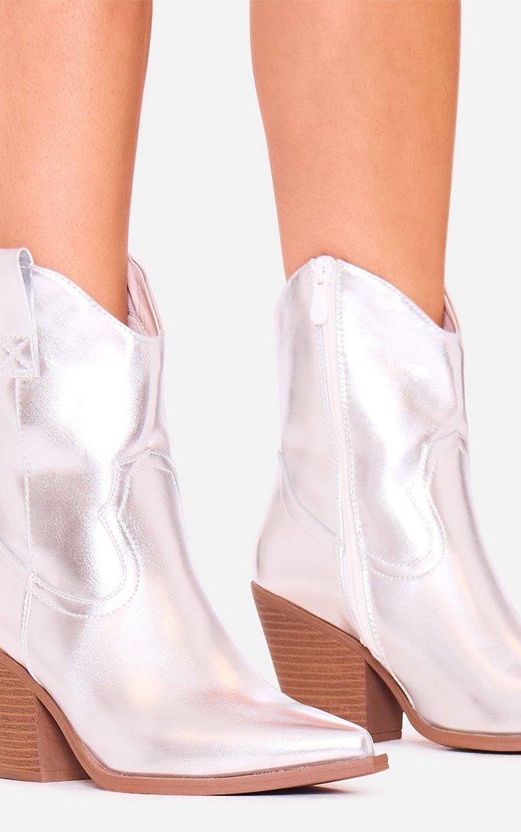 Harrison Block Heel Pointed Toe Western Cowboy Ankle Boot In Silver Faux Leather