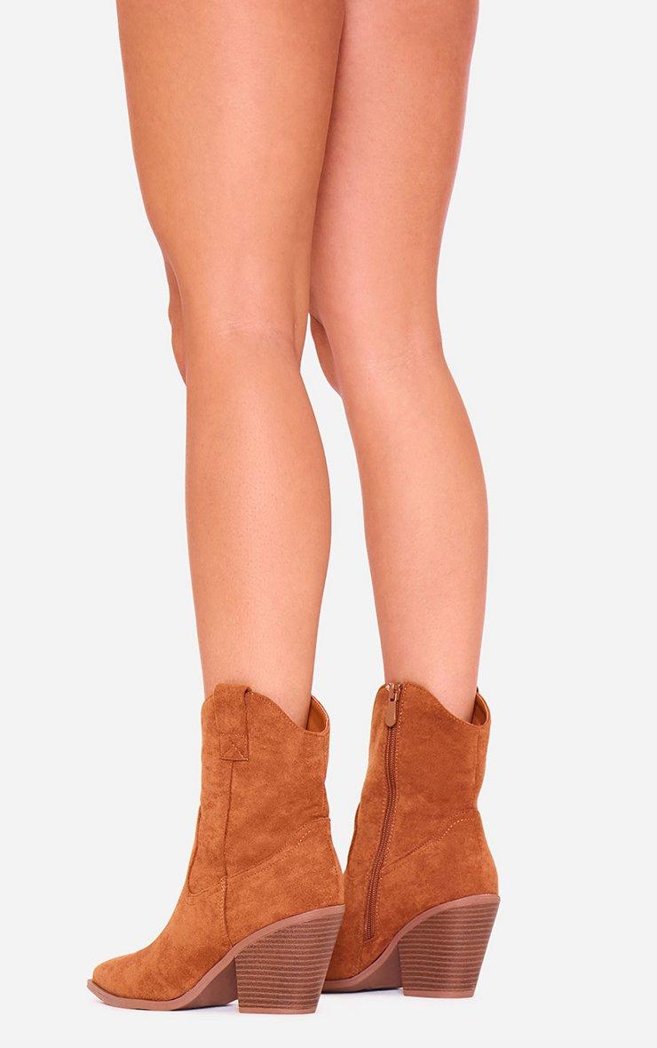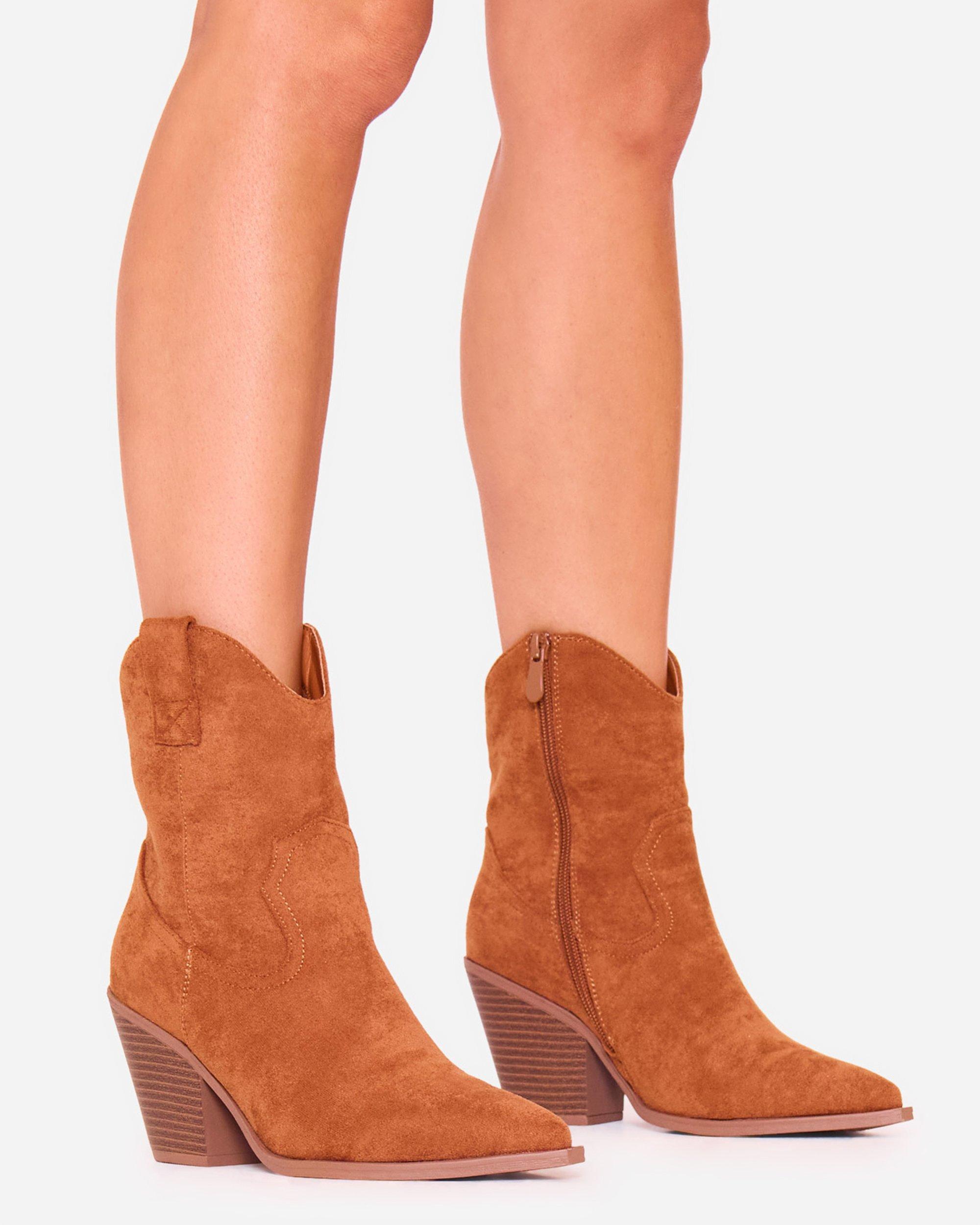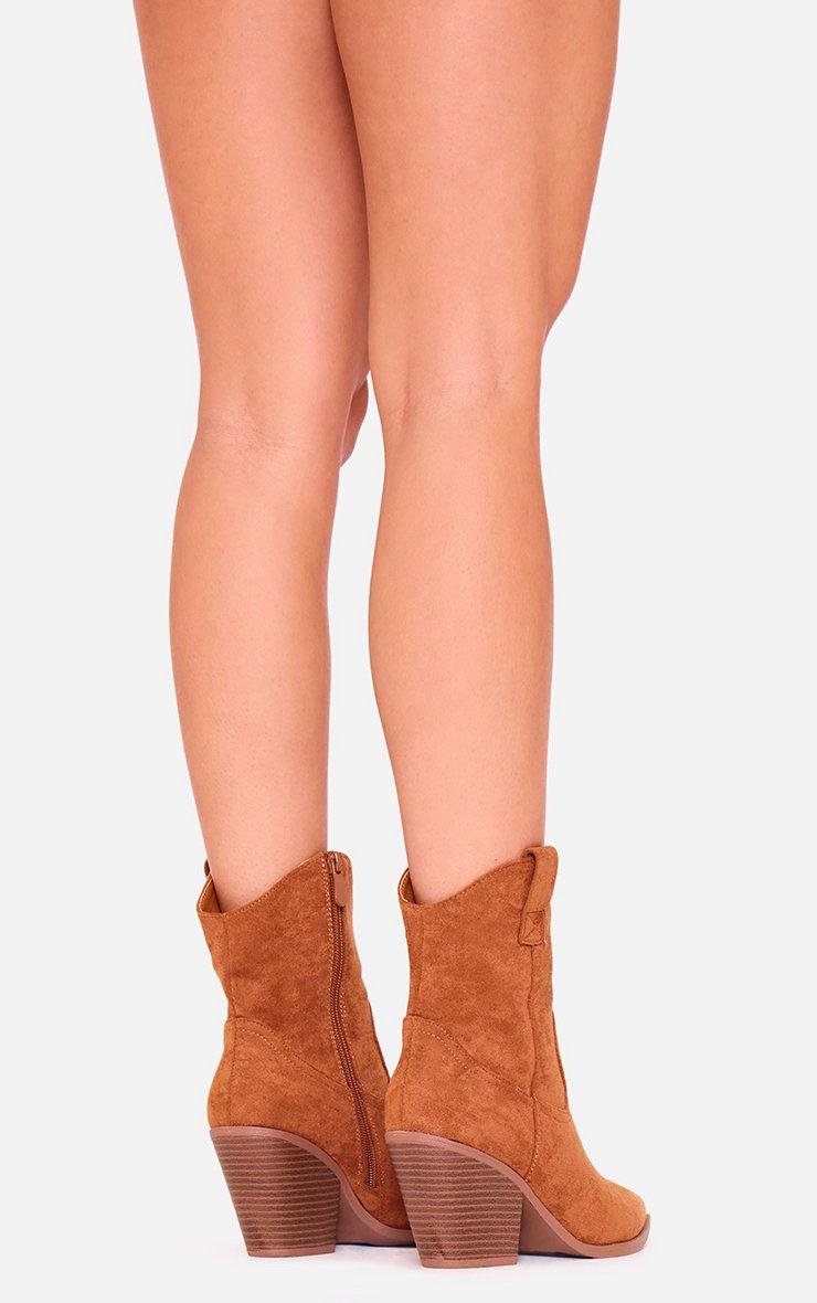 Toni Block Heel Pointed Toe Western Cowboy Ankle Boot In Camel Faux Suede