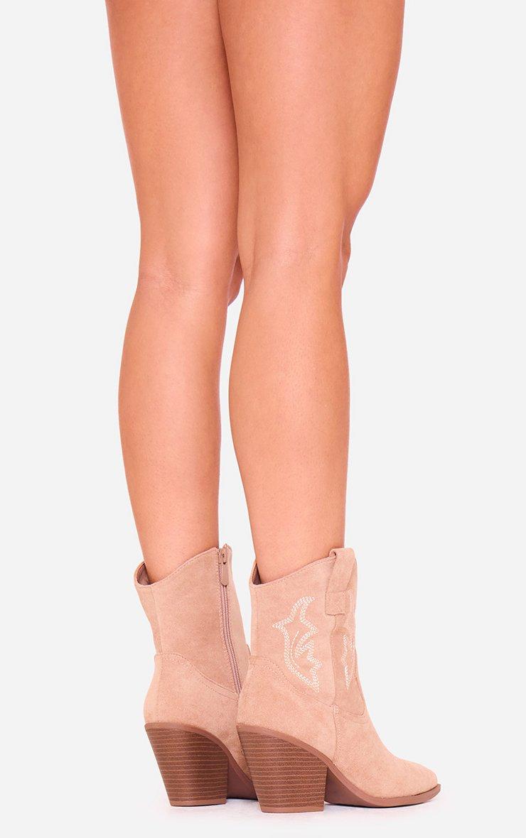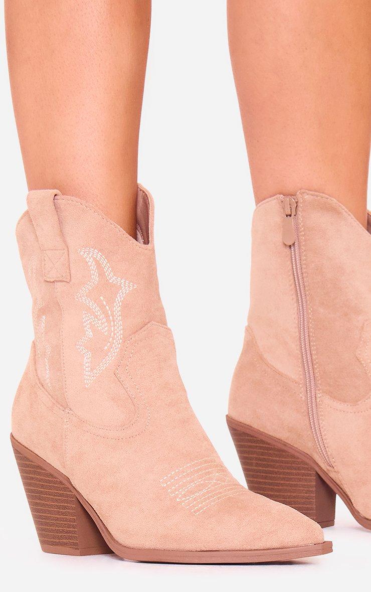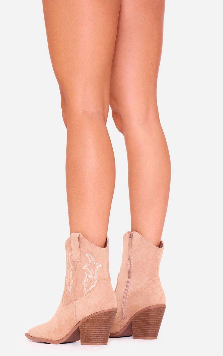 Yazmin Embroidered Detail Block Heel Pointed Toe Ankle Boot In Taupe Faux Suede