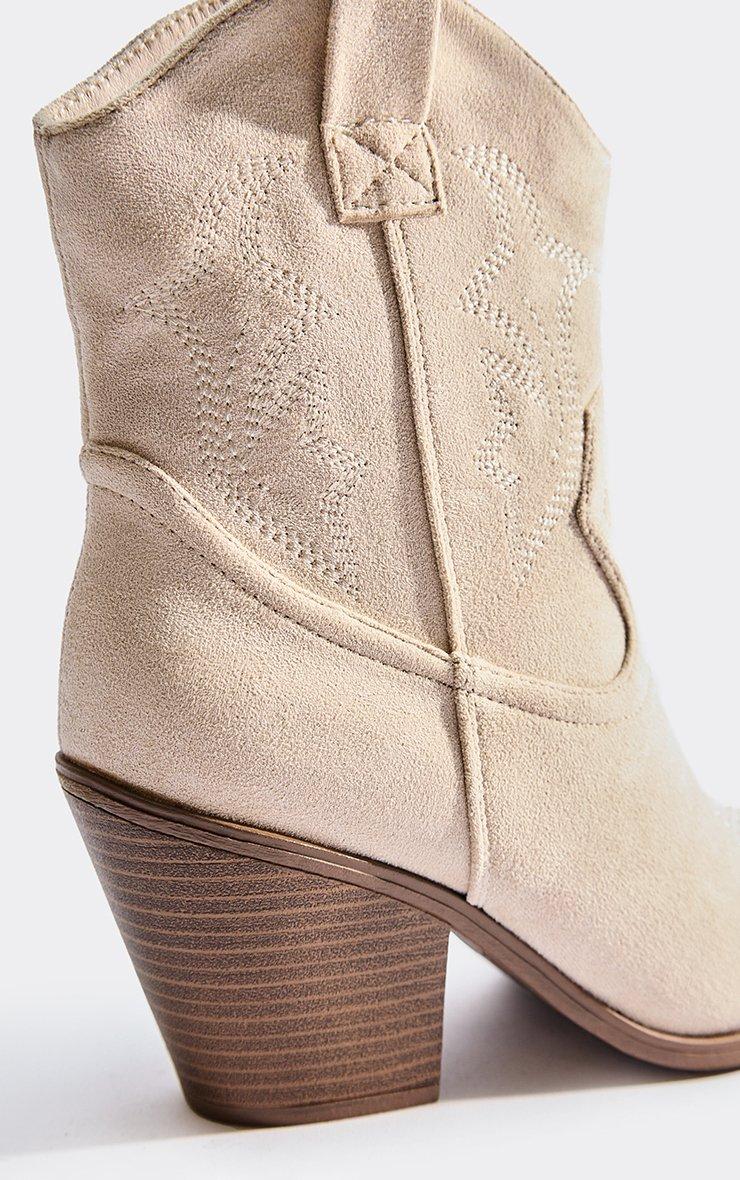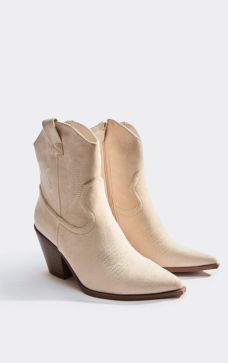 Yazmin Embroidered Detail Block Heel Pointed Toe Ankle Boot In Beige Faux Suede