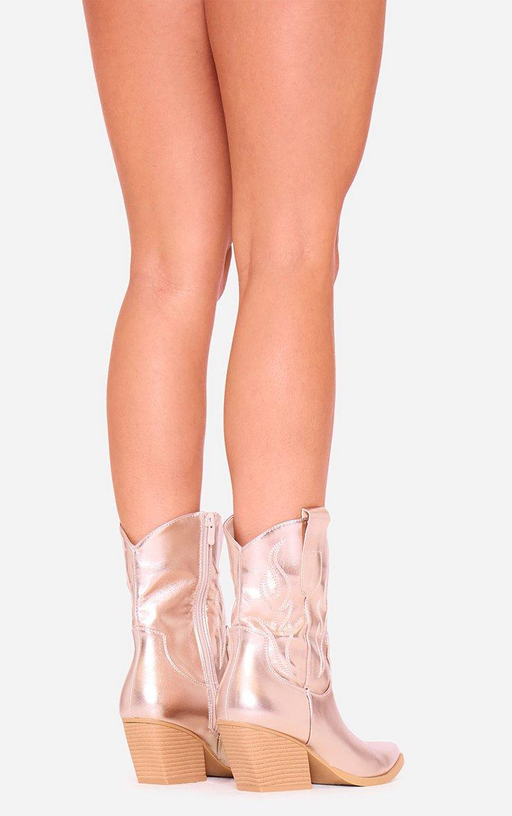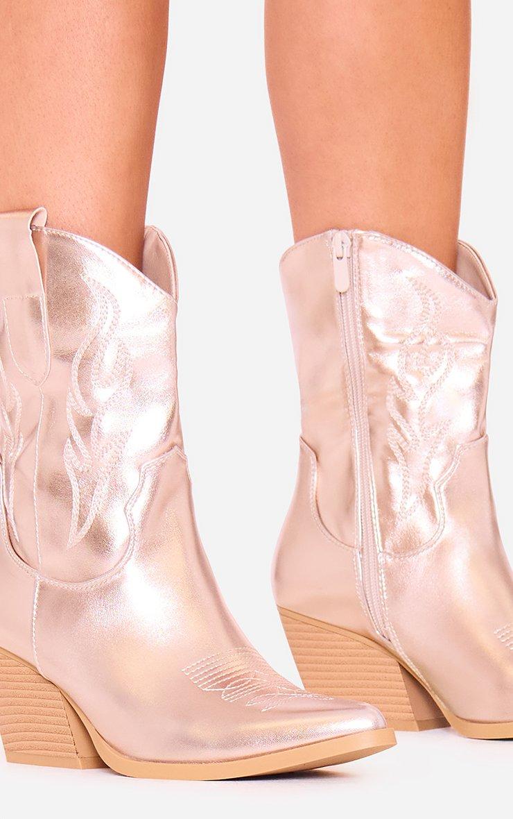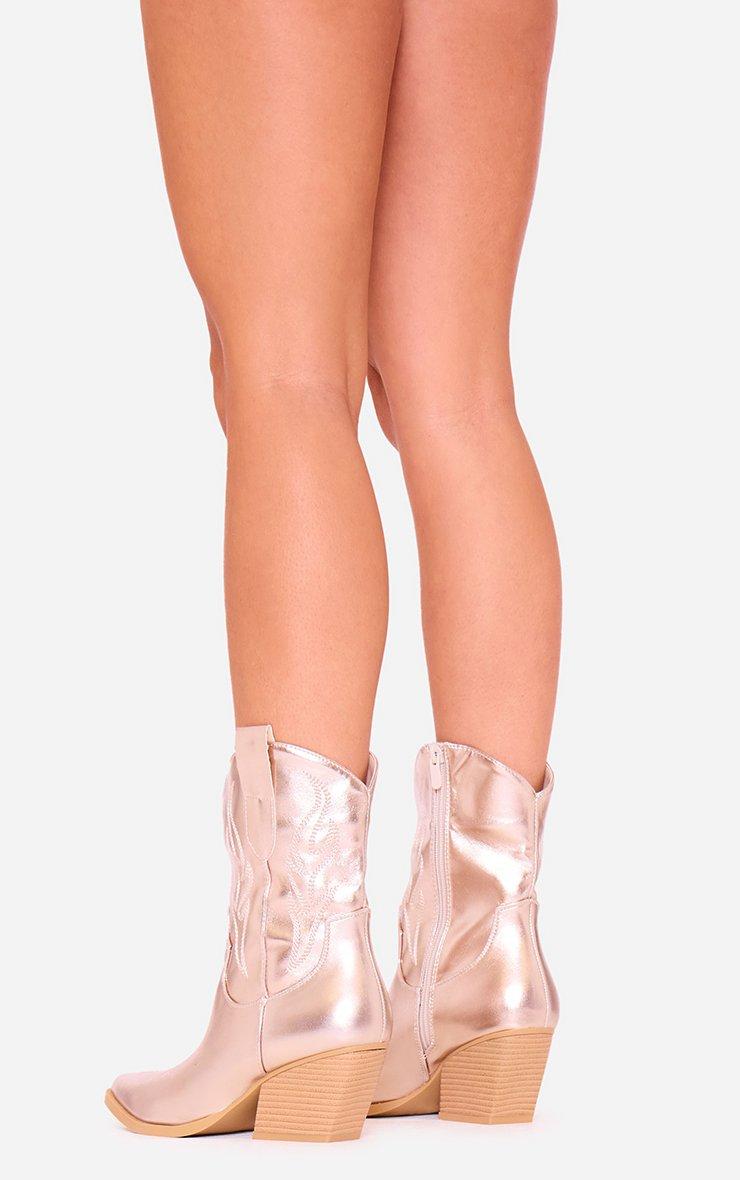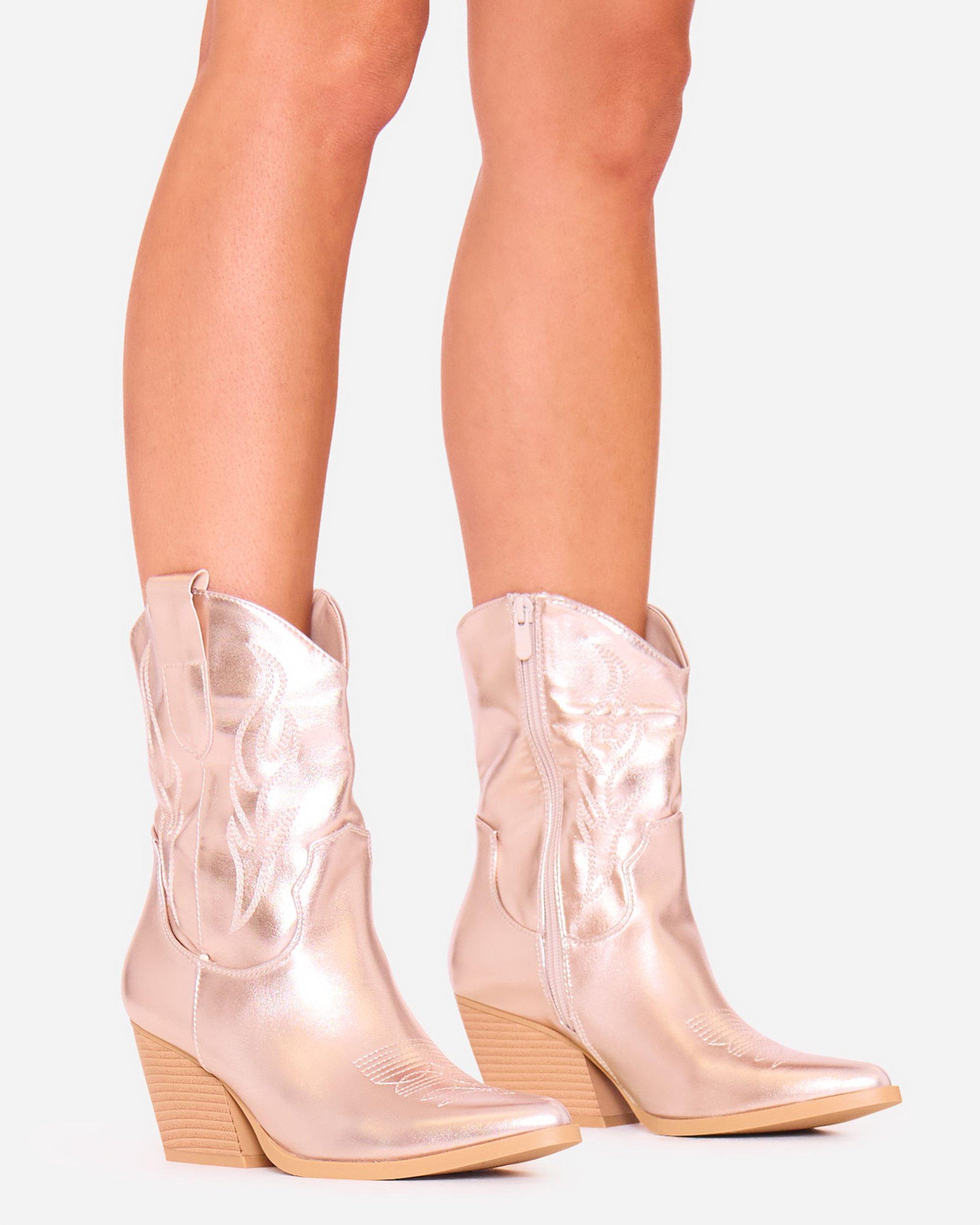 Mafia Embroidered Detail Block Heel Pointed Toe Western Cowboy Ankle Boot In Gold Faux Leather