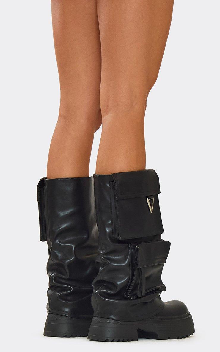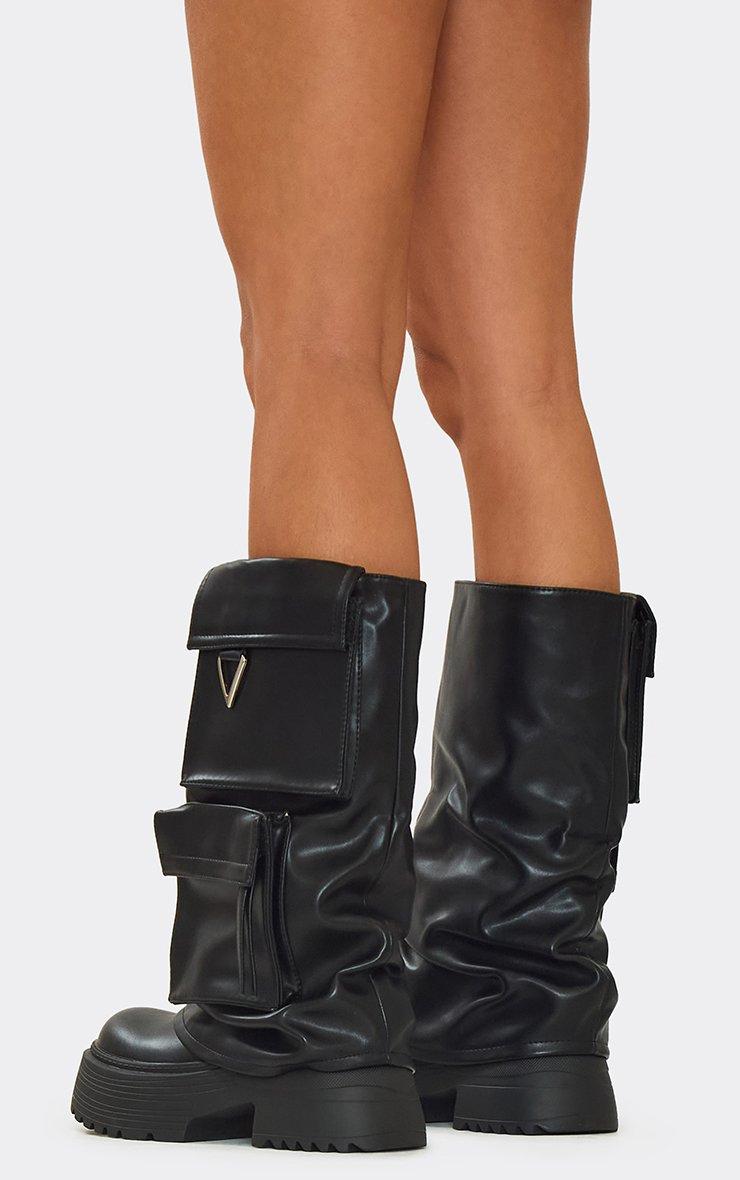 Draws Side Pocket Detail Chunky Sole Mid Calf Biker Boot In Black Faux Leather