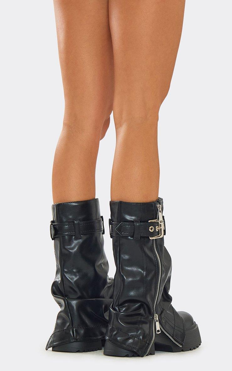 Crisp Buckle Detail Chunky Mid Calf Biker Boot In Black Faux Leather