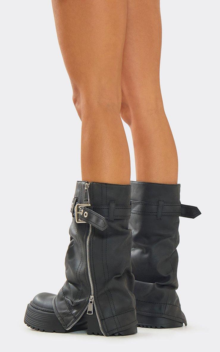 Mona Buckle Detail Knee High Boot In Black Faux Leather