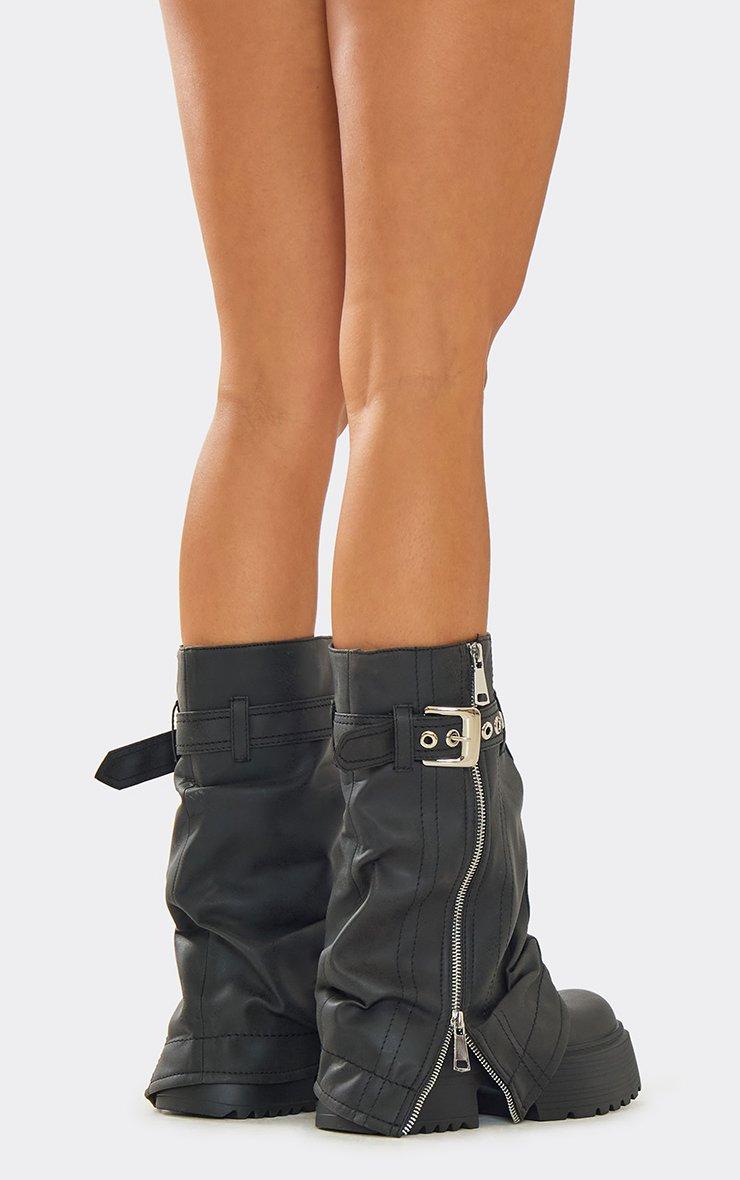 Poster Side Zip Split Belted Chunky Mid Calf Biker Boot In Grey Faux Leather