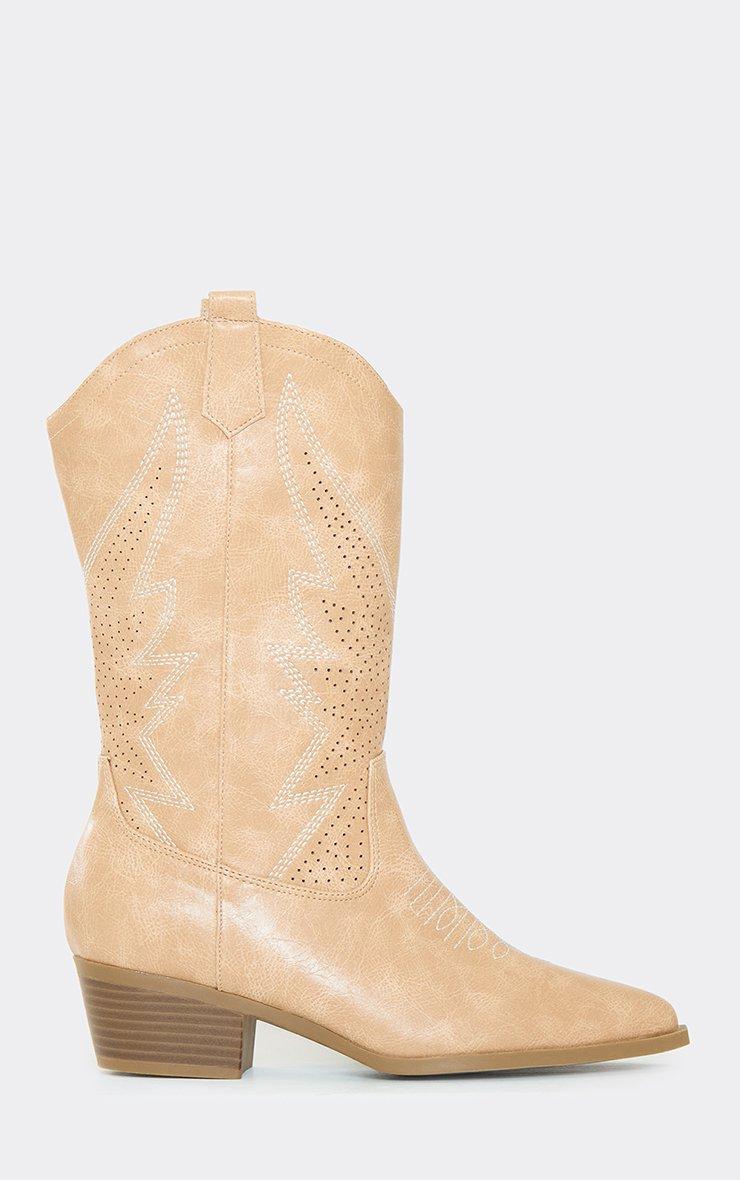poinee embroidered detail western cowboy ankle boot in beige distressed faux leather
