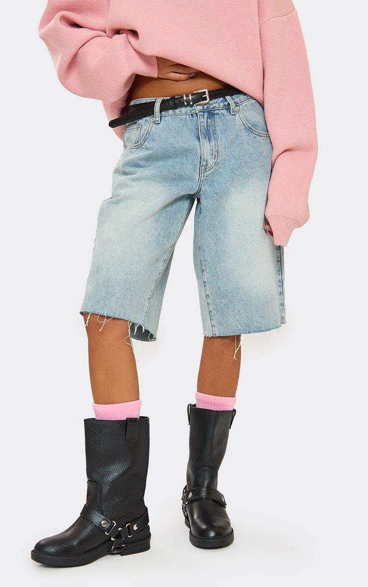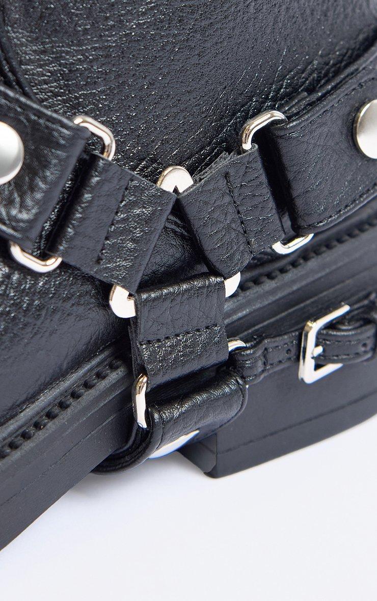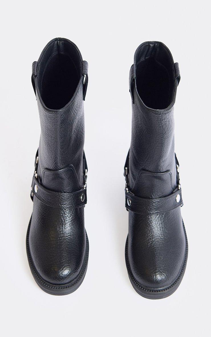 Crisp Buckle Detail Chunky Mid Calf Biker Boot In Black Faux Leather