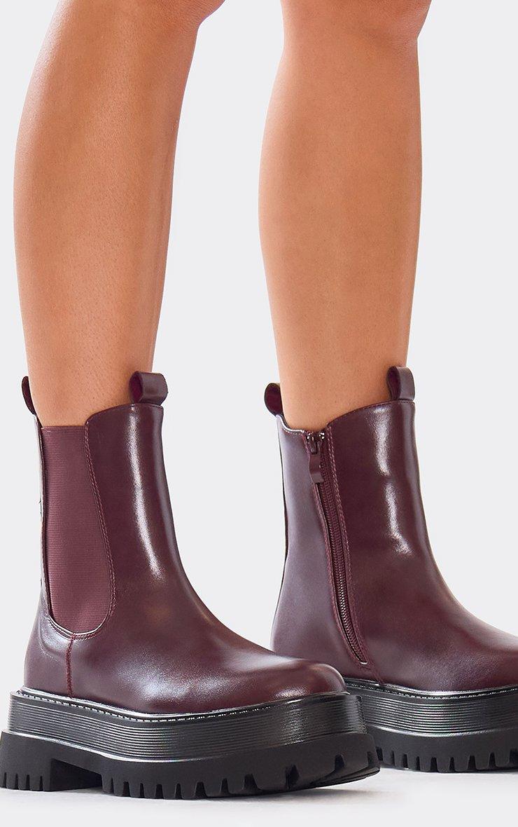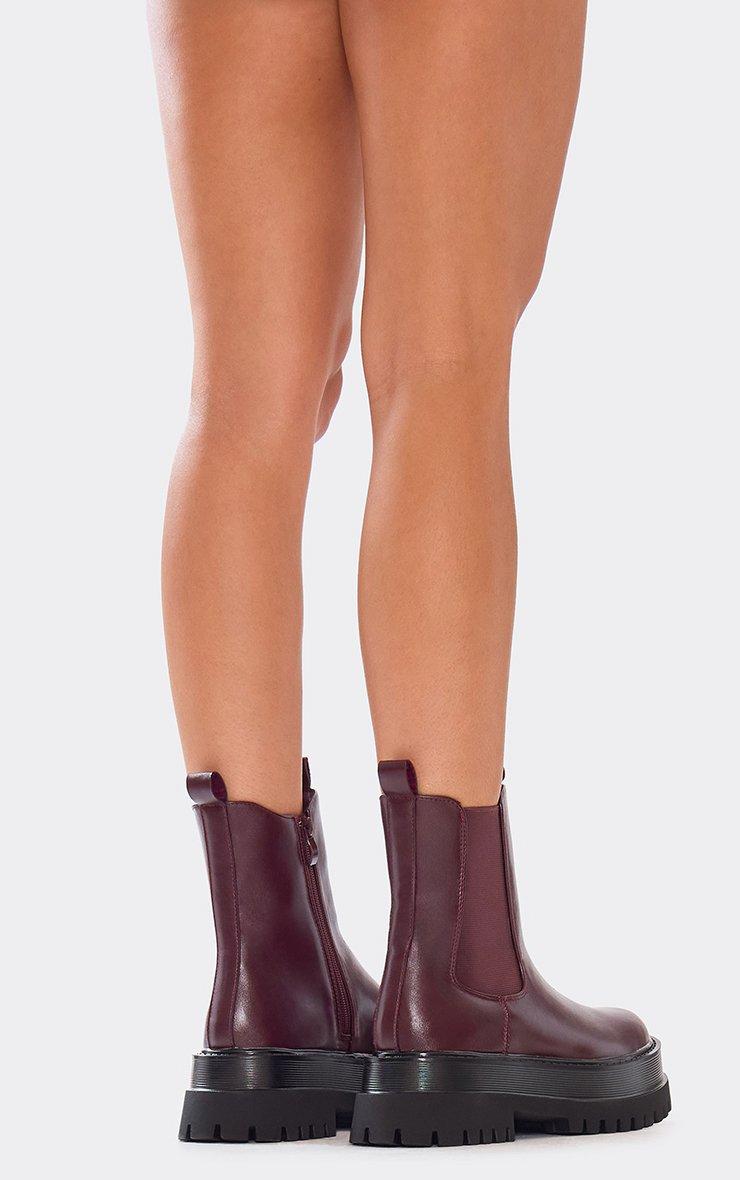 Scarla Chunky Sole Ankle Chelsea Biker Boot In Burgundy Faux Leather