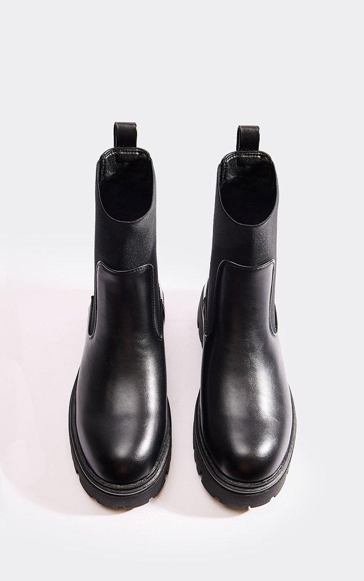 Twirl Chunky Sole Elastic Detail Ankle Biker Boot In Black Faux Leather