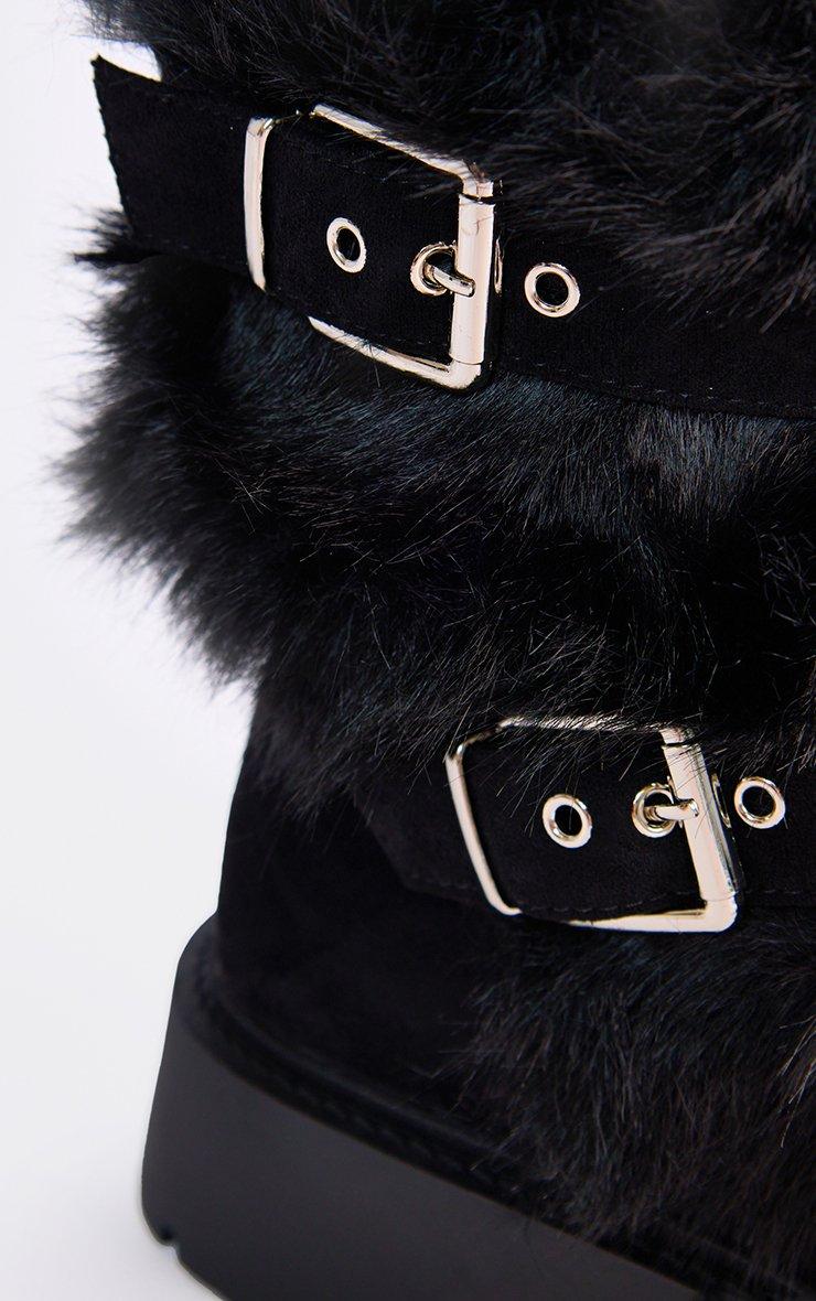 Button Double Buckle Strap Contrast Faux Fur Ankle Biker Boot In Black Faux Suede