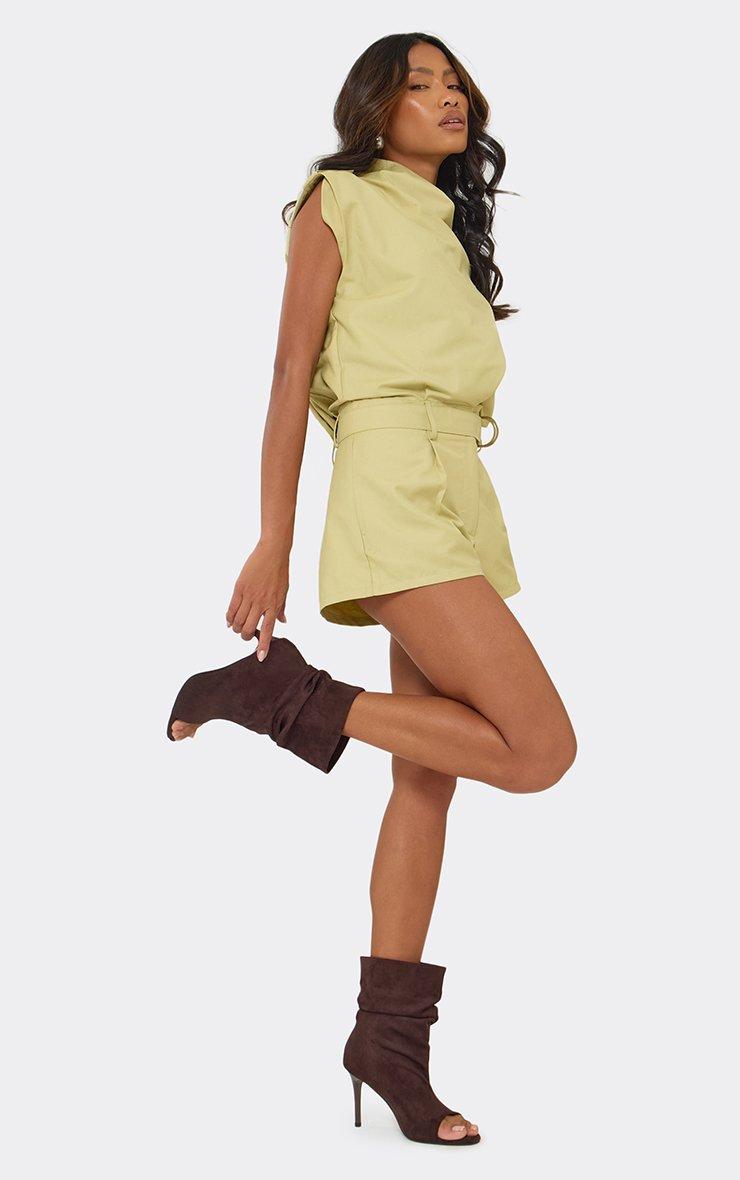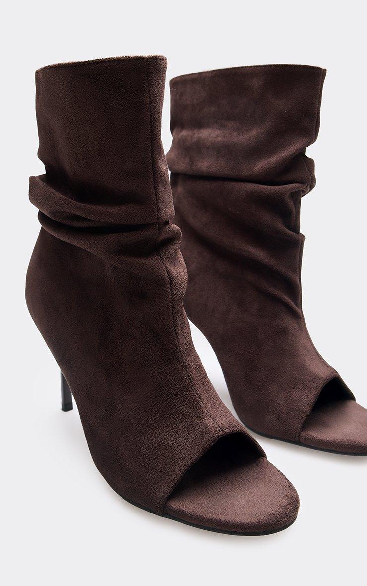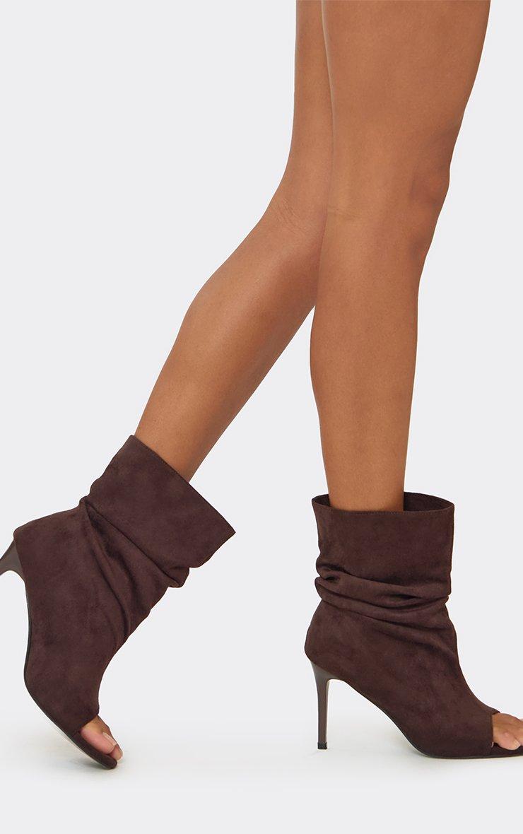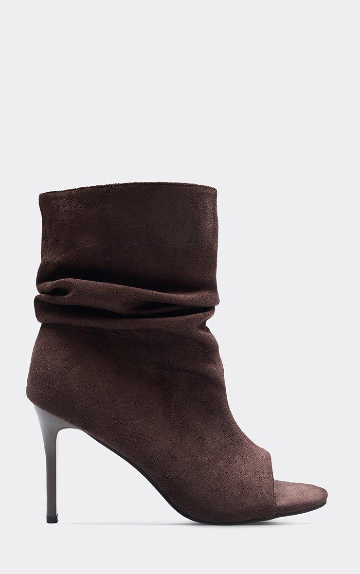 innocent peep toe stiletto heel ruched ankle boot in brown faux suede