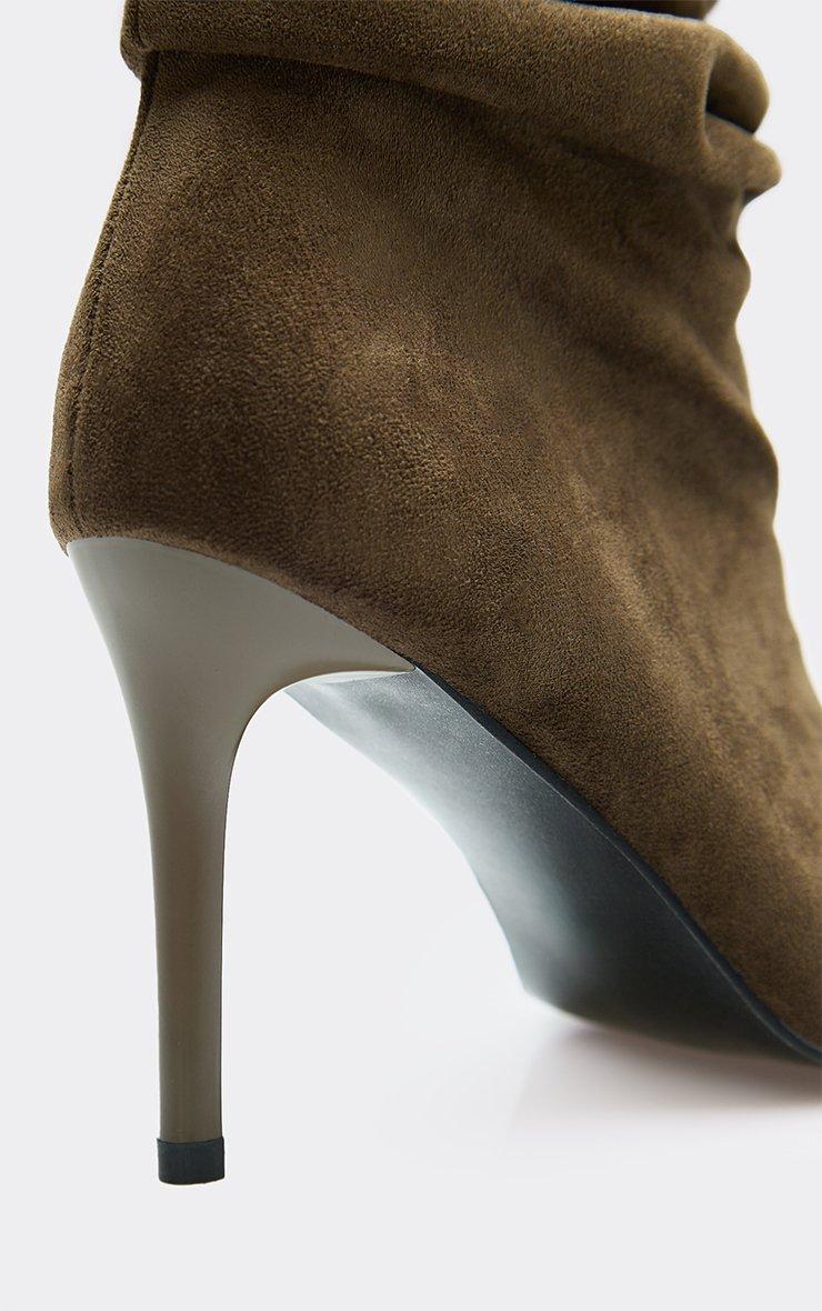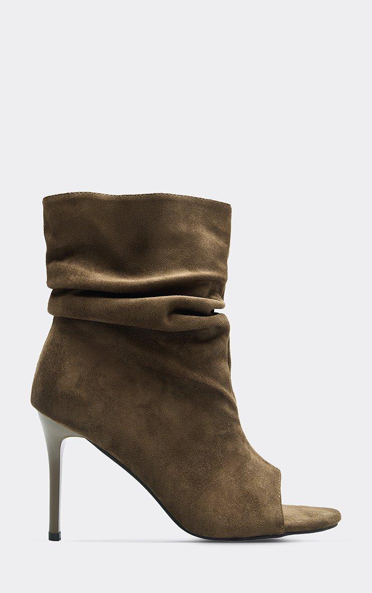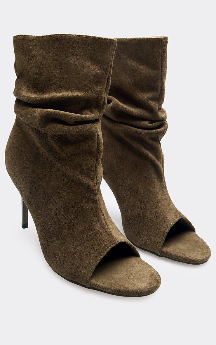 innocent peep toe stiletto heel ruched ankle boot in khaki faux suede