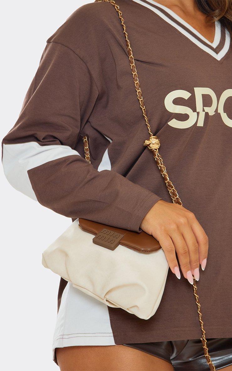 Dyhan Logo Detail Chain Strap Shaped Cross The Body Bag In Beige And Tan Brown Faux Leather