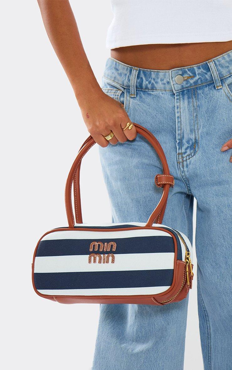 Apollo Logo Detail Striped Shoulder Bag In Navy Blue Faux Leather