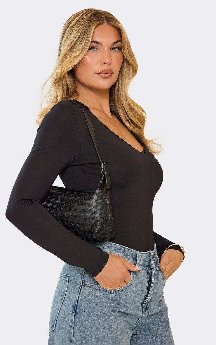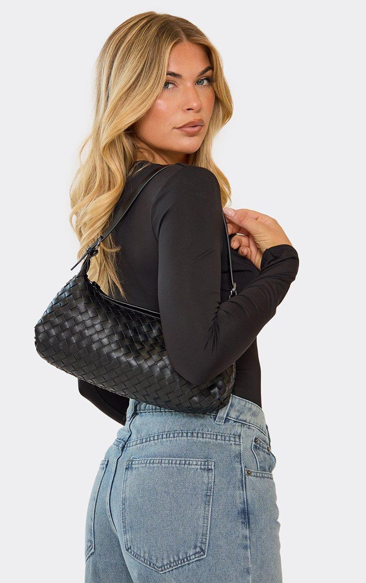 Maria Woven Detail Shaped Shoulder Bag In Black Faux Leather
