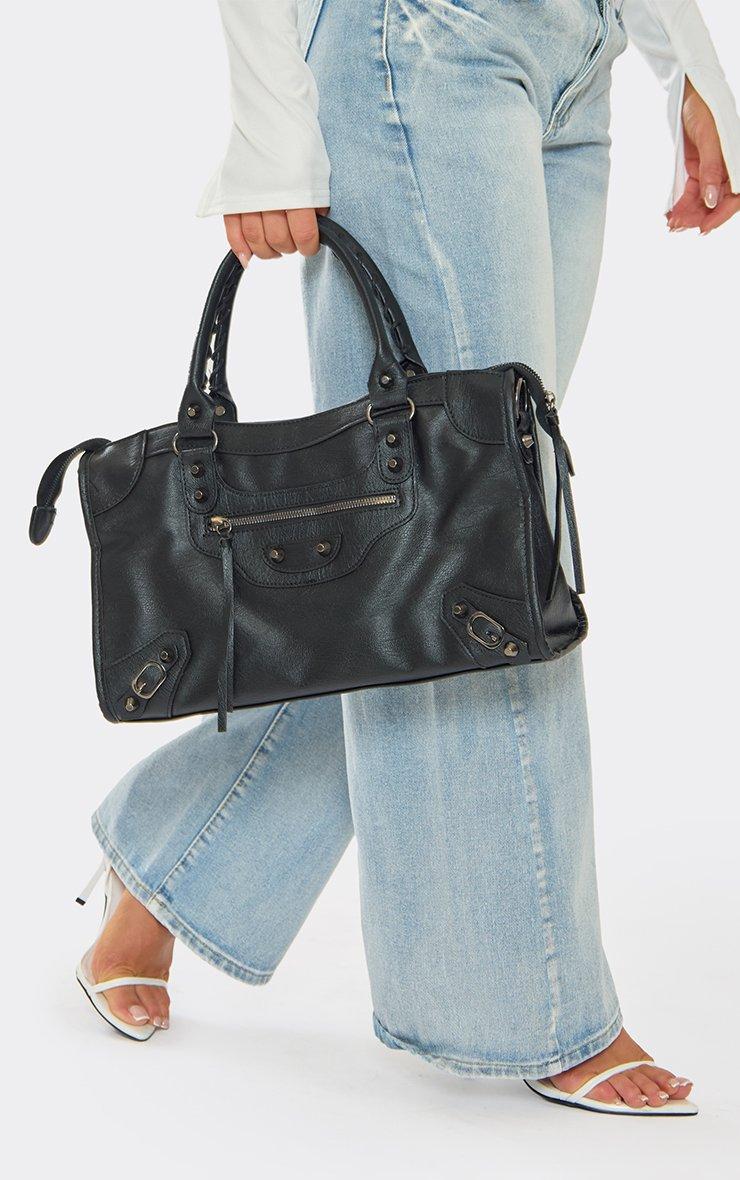 Store Studded Lock Detail Shaped Grab Bag In Black Faux Leather