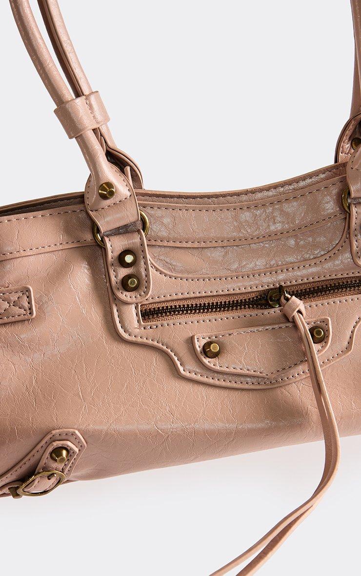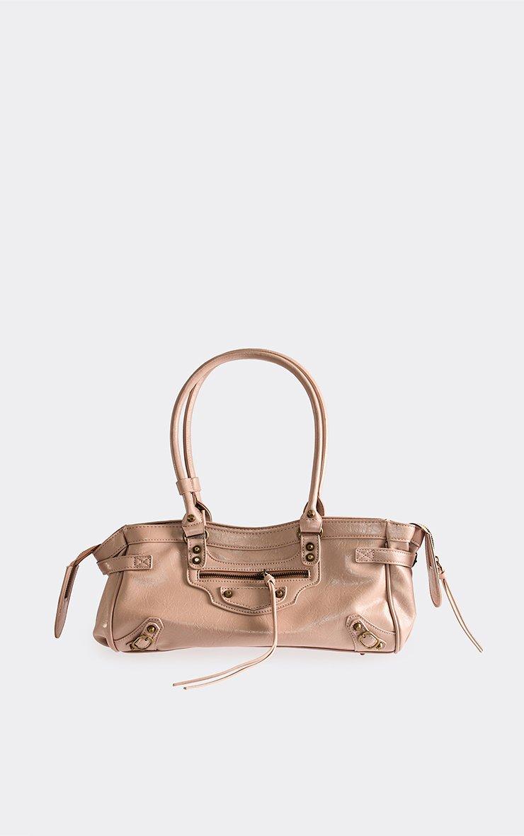 reegan studded zip detail rectangle shaped shoulder bag in nude faux leather