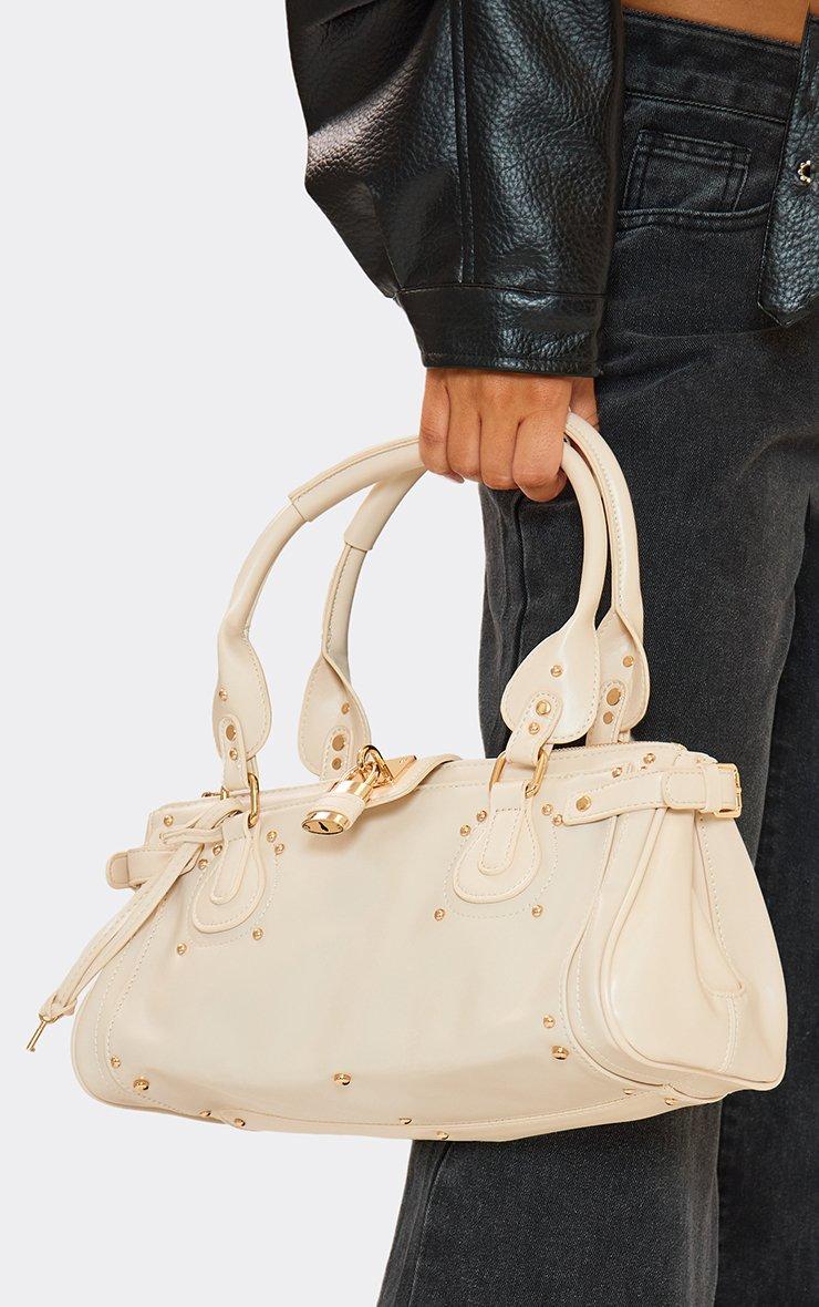 Store Studded Lock Detail Shaped Grab Bag In Cream Faux Leather