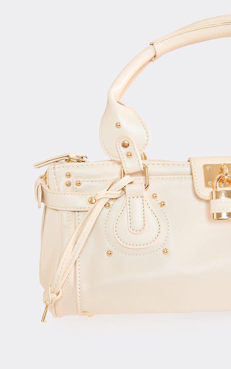 store studded lock detail shaped grab bag in cream faux leather