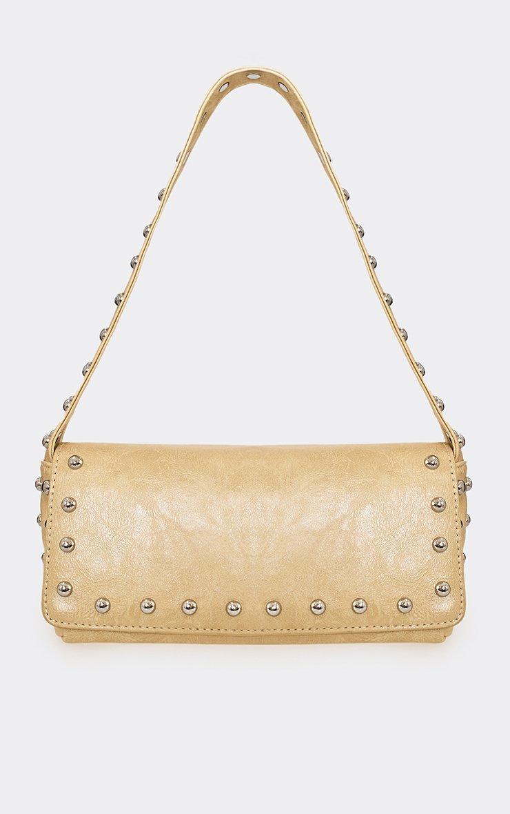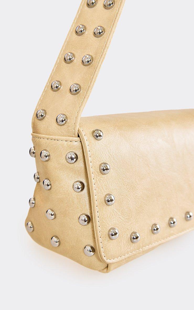 worker stud detail rectangle shaped shoulder bag in cream faux leather