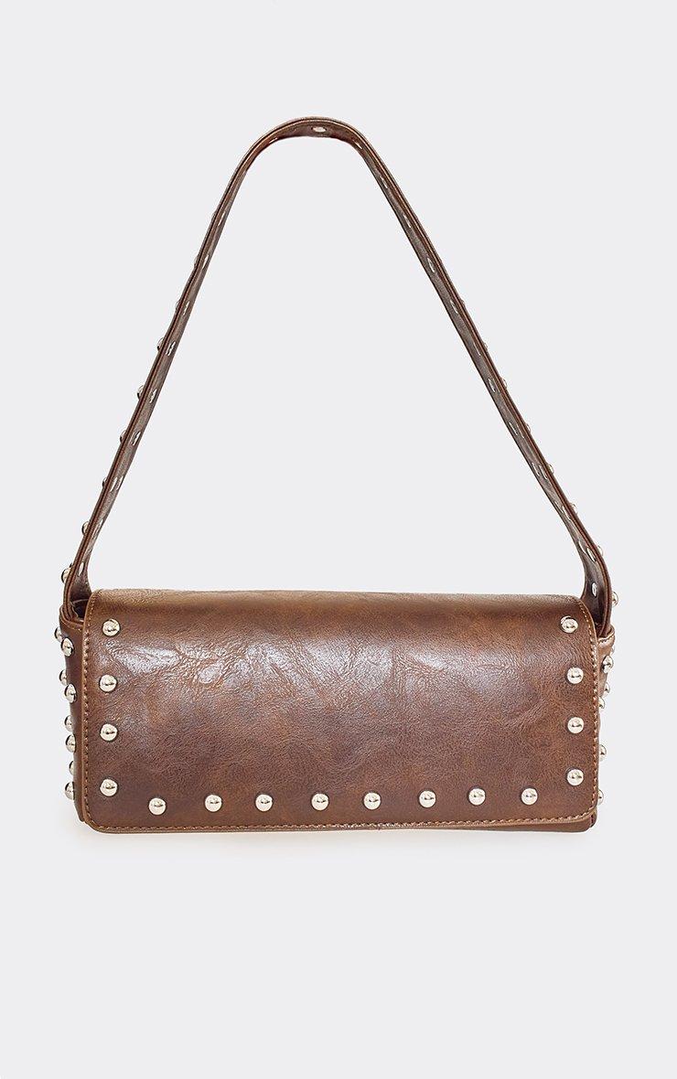 Worker Stud Detail Rectangle Shaped Shoulder Bag In Brown Faux Leather
