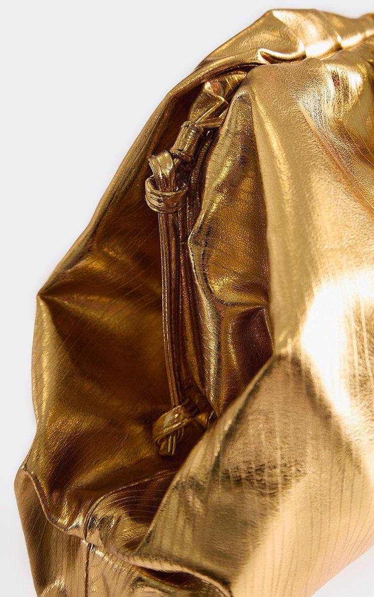 Moon Drawstring Detail Top Handle Grab Bag In Gold Faux Leather