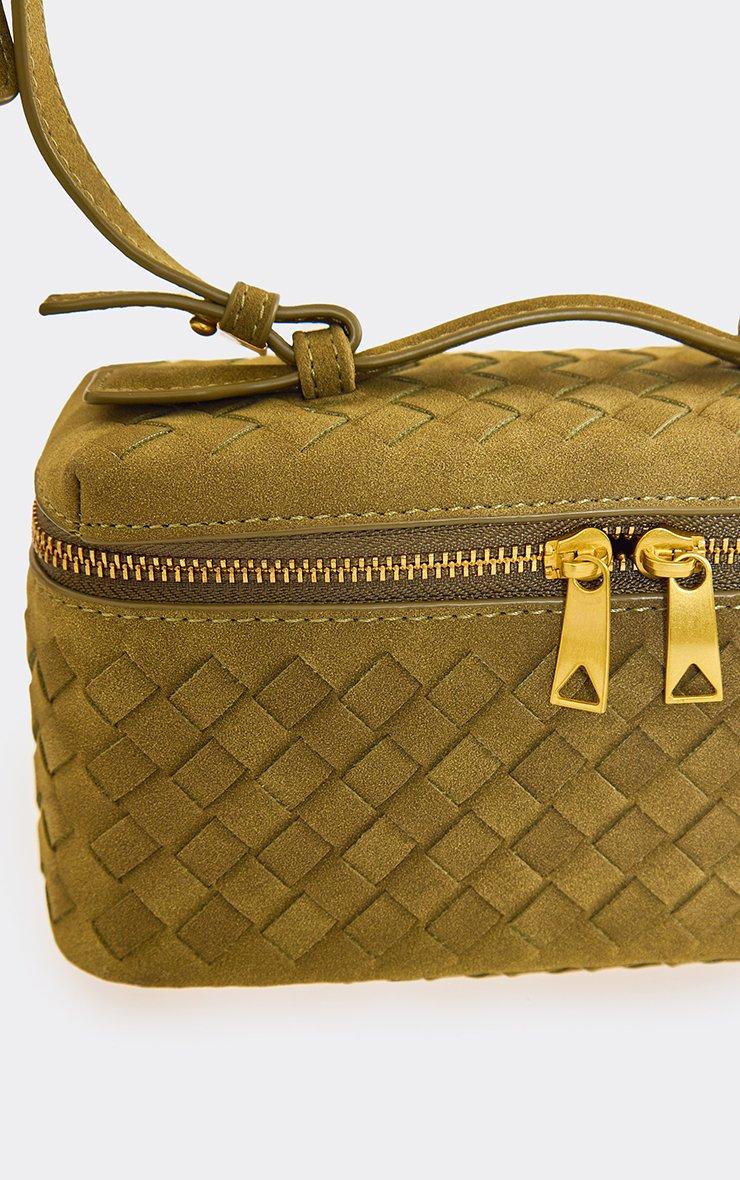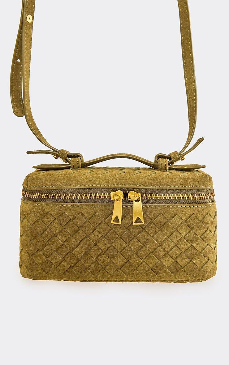Benjen Woven Detail Shaped Cross Body Bag In Khaki Faux Suede