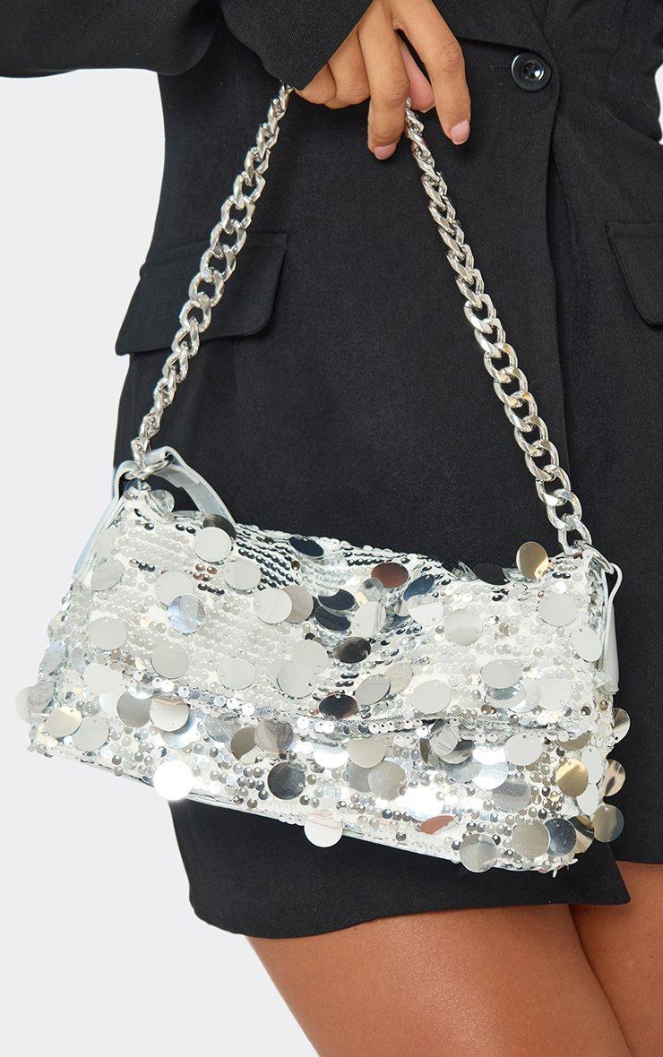 boogie chain detail cross body bag in silver disc sequin