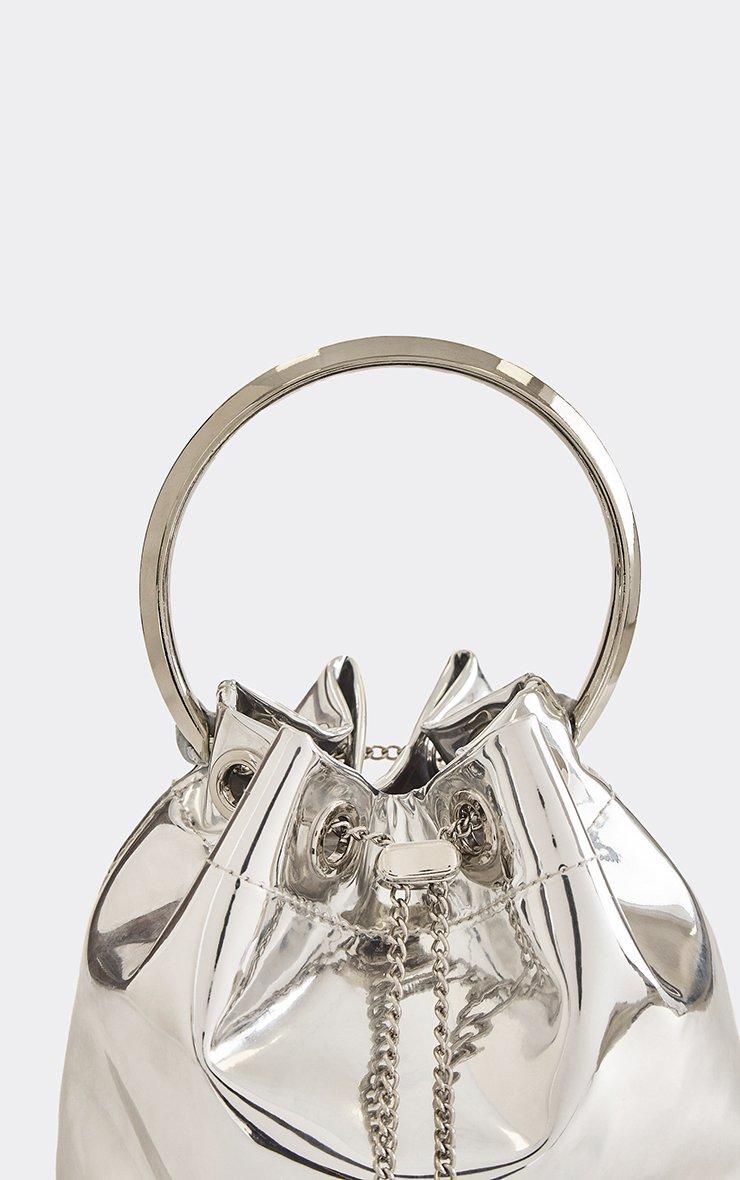 Moon Drawstring Detail Top Handle Grab Bag In Silver Faux Leather