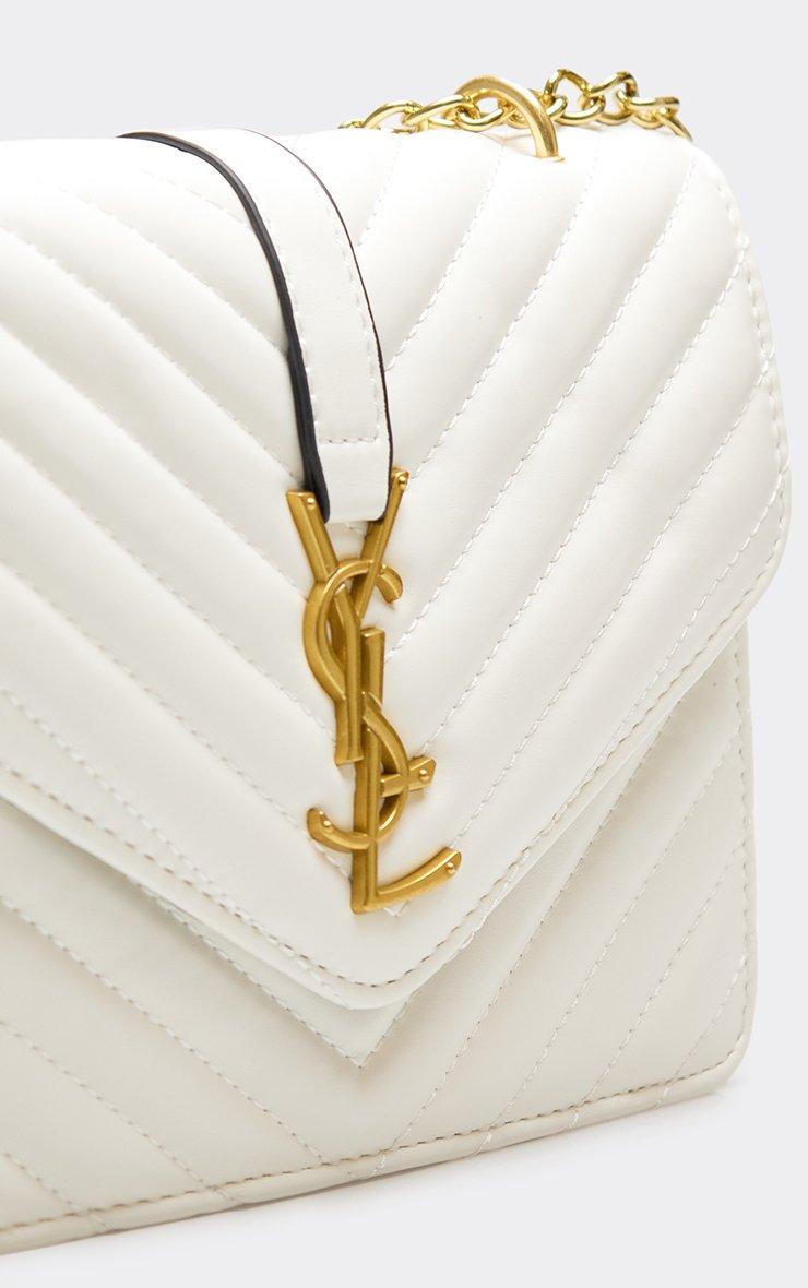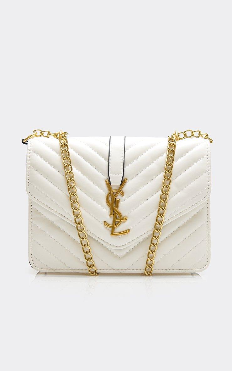 Wander Chain Strap Cross Body Bag In White Woven Faux Leather.