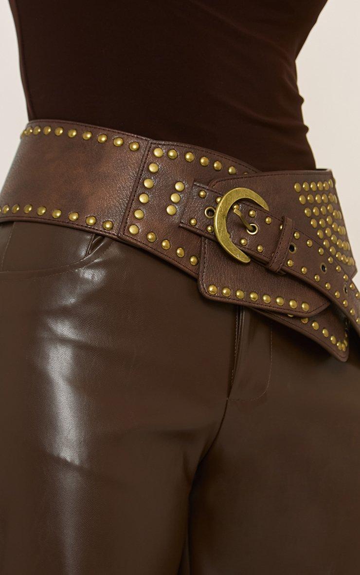 Oversized Stud Detail Chunky Belt In Brown Faux Leather