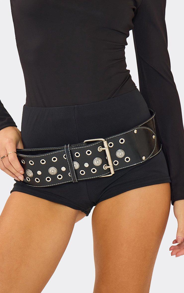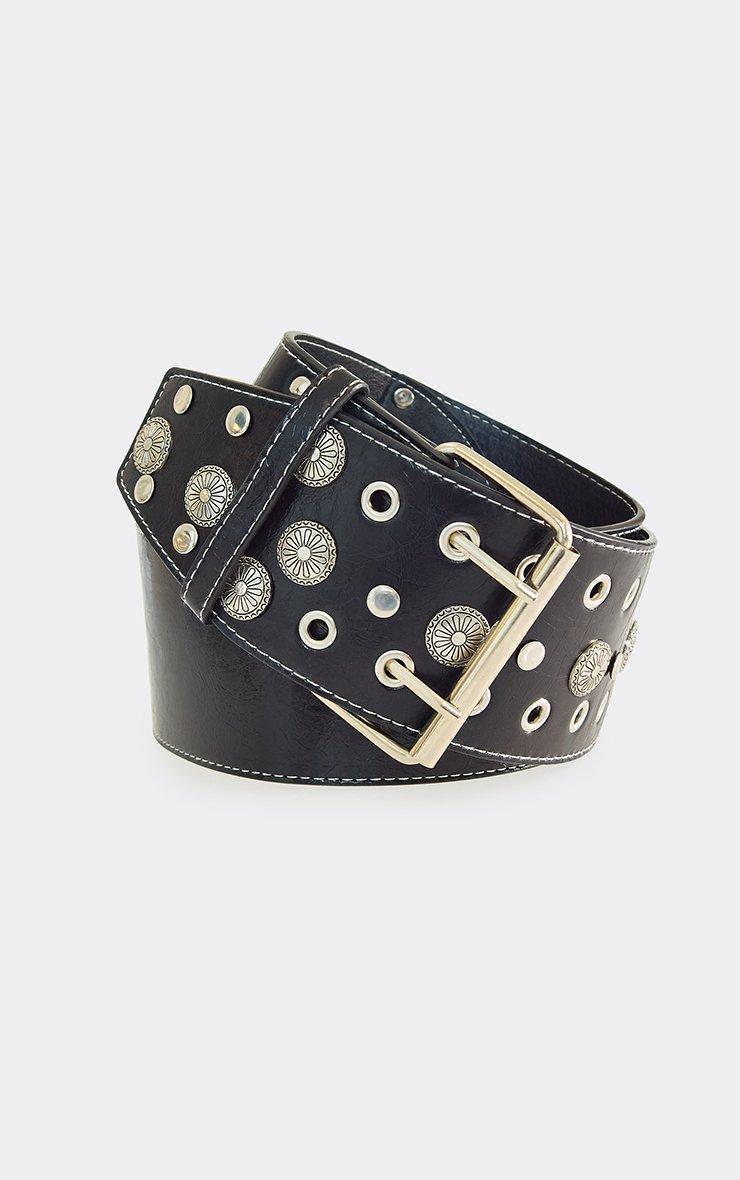 Eyelet Stud Detail Chunky Belt In Black Faux Leather