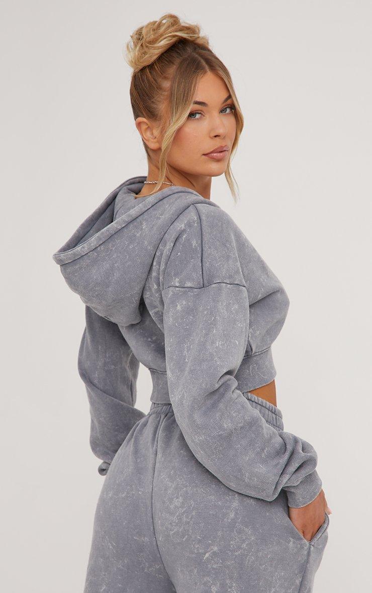 Long Sleeve Oversized Zip Detail Cropped Hoodie In Light Grey Acid Wash